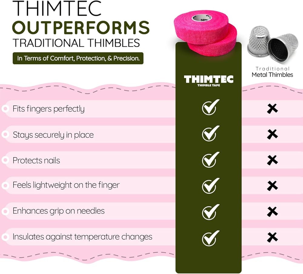 𝟐-𝐏𝐀𝐂𝐊 𝐖𝐇𝐈𝐓𝐄 𝐂𝐋𝐎𝐔𝐃 𝐓𝐇𝐈𝐌𝐁𝐋𝐄 𝐓𝐀𝐏𝐄: The Thimtec finger protectors for sewing come in convenient packs of 2 rolls, providing a fully customizable experience for the arts & crafts enthusiast. The multicolored sewing thimble finger protector is easy to use even for first timers: simply cut off at least 8-10 inches of tape, wrap tightly and squeeze, to mold the material around your finger!