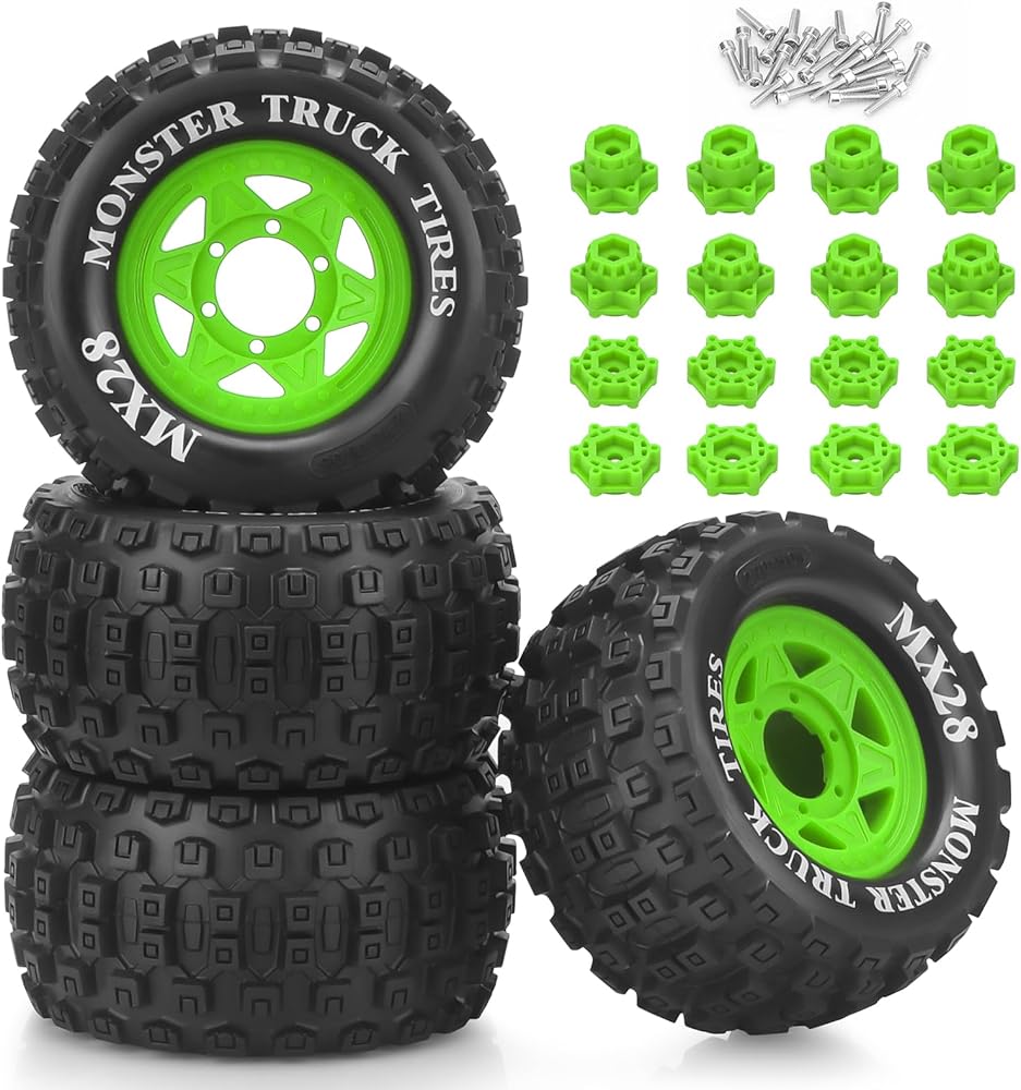 MX28 F/R 2.8" RC Car Tires with 12mm/14mm Hex Adapter RC Wheels and Tires Set 1/10 RC Truck Wheels for Arrma Big Rock Granite Traxxas Rustler Stampede VORTEKS 3S 4PCS (Style B) - Green