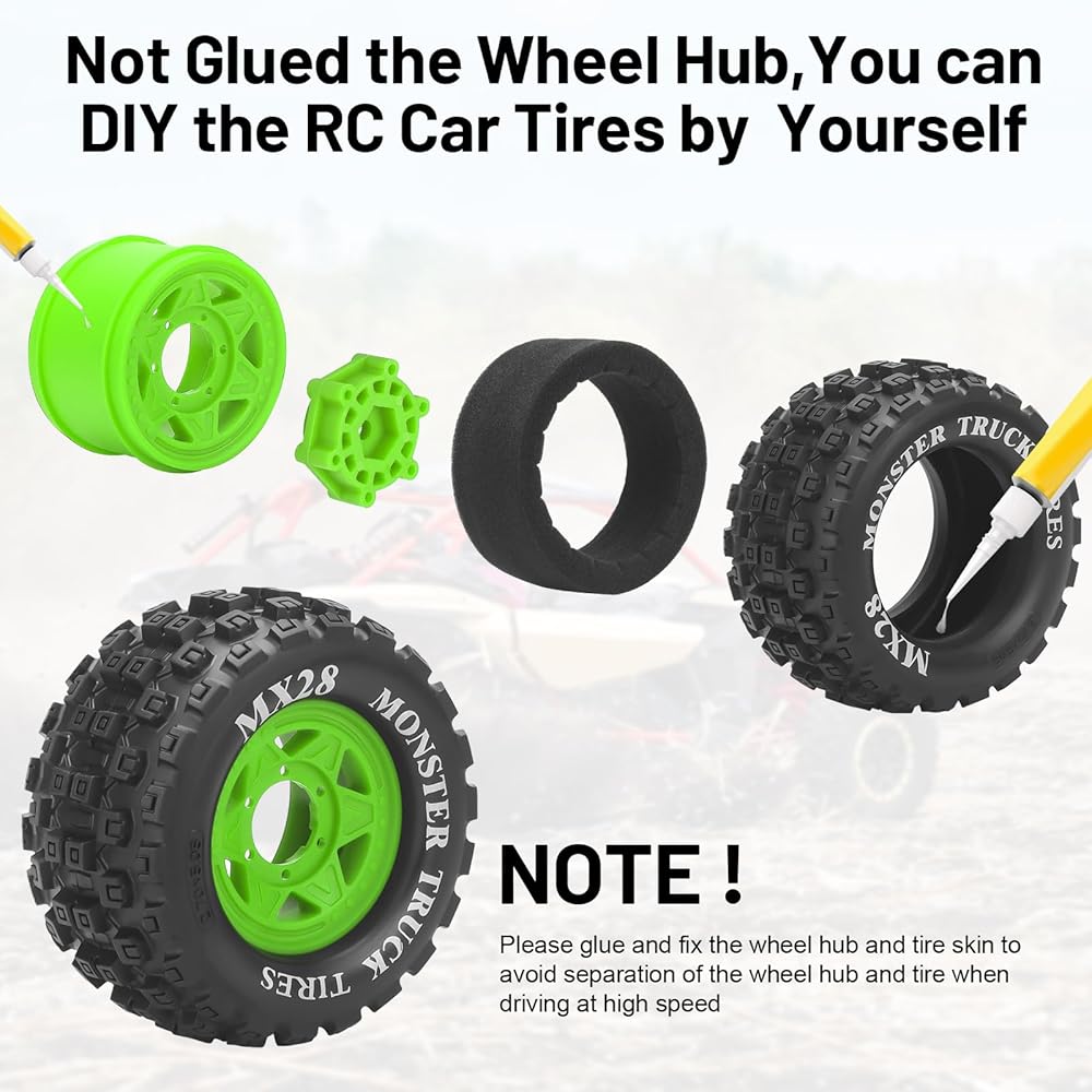 What You will Get - The package included 4 x RC wheel and tire set (Not Glued); four sets of hexagonal adapters of different specifications. Easily change the wheel's offset to suit different applications by simply changing the hexagon. Please clean the surface of the rim and tire before gluing, recommand to use professional tire glue