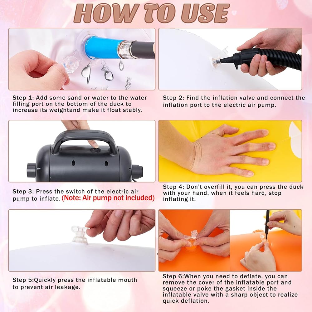 1. Find the water plug at the bottom of the inflatable duck, add some water, fill up the water bag and fix the water plug to keep the duck stable, then open the inflatable valve and put the nozzle on the outlet of the electric inflatable pump (not included).