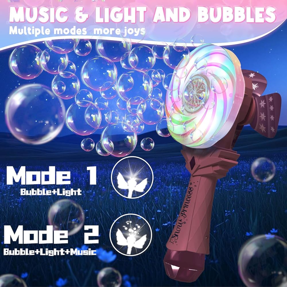 Dual Mode Fun: Mode 1 lights up with a charming glow, creating a magical vibe. Mode 2 combines lights and colorful bubbles for enhanced playtime alone or with friends