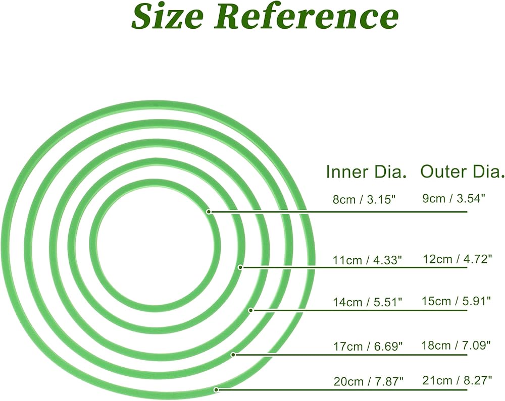 Dimension -There are 5pcs different sizes in the package, the diameter is about: Inner Diameter(Min-Max): 8cm-20cm / 3.15" -7.87", Outer Diameter(Min-Max): 9cm-21cm / 3.54" -8.27". Floating plant ring sets of different sizes can meet your different needs. Please remember to confirm the size before buying