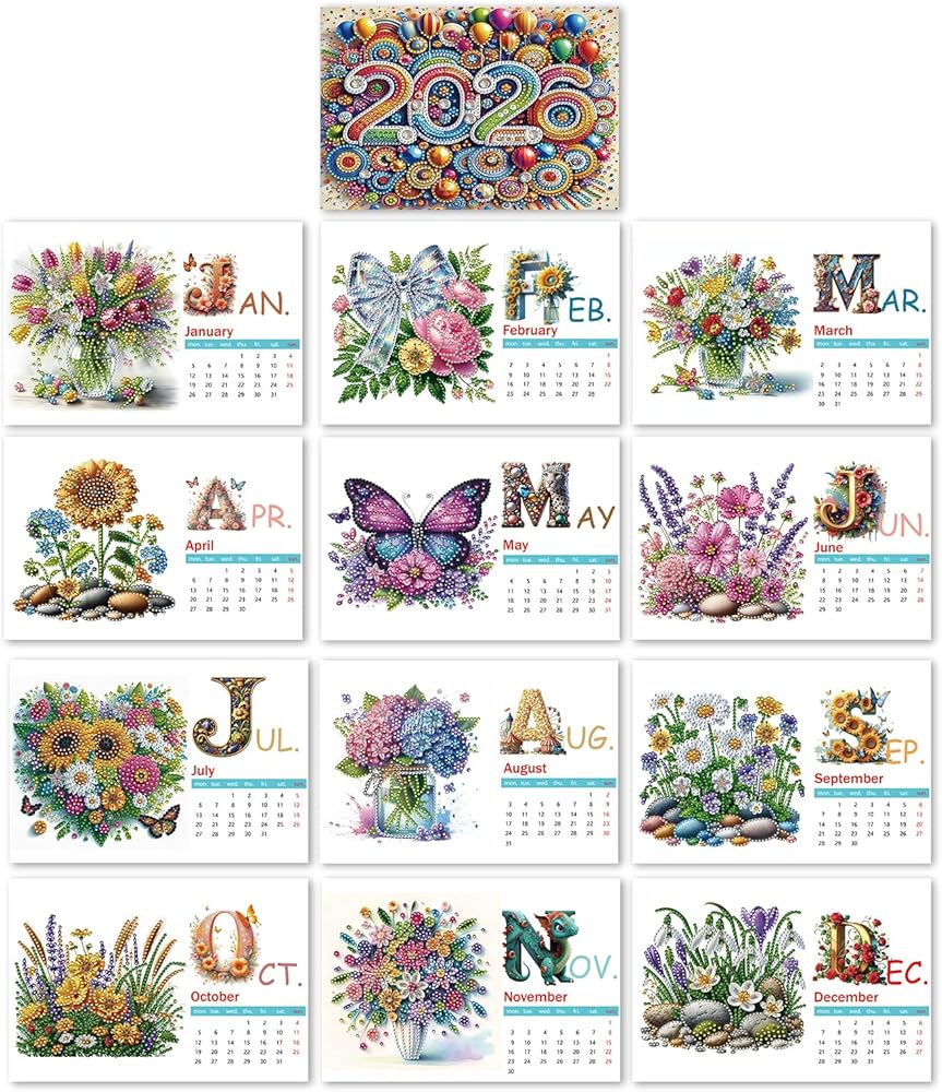 2025 Desk Calendars: Package Included: 1X desk calendar (each page needs to be drilled by yourself), 1 X diamond art tool kit (Colorful Diamond Bag, Clay Glue Pen and Diamond Tray).