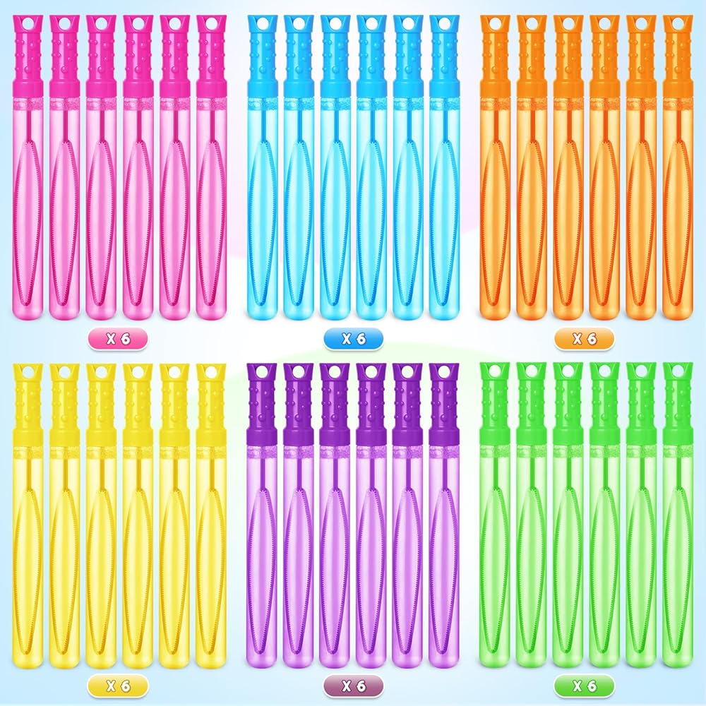 Super Value Bulk: The package includes 36 pcs 2 oz giant bubble wands with an easy-to-grip design handle, containing 6 bright vibrant colors, 6 pcs of each color, which are more attractive and easy to use.These wands are great for kids of all ages to create bubbles by blowing or waving the wand.