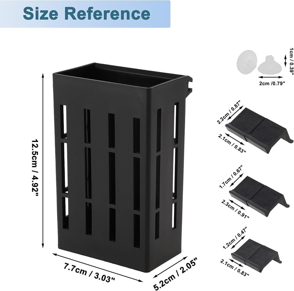 Dimension - The fish tank plant holder is 3.03 inches long, 2.05 inches wide, and 4.92 inches high; It comes with 3 different size hooks (0.47 inches/0.67 inches/0.87 inches); The suction cup diameter is 0.79 inches