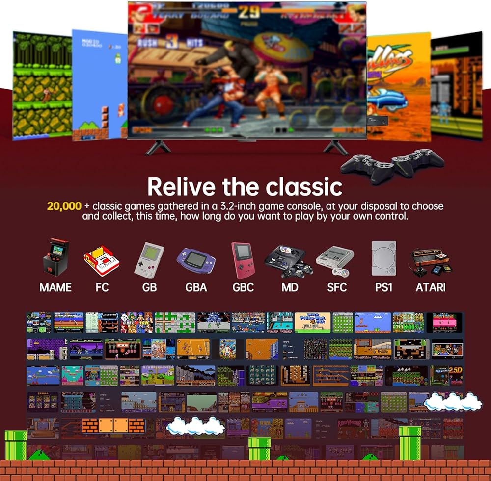 • Extensive Game Library:The collision of advanced technology and the memory of the times, do not have to worry about having to replace the retro drive or game stick in order to play different video games, 20,000 + classic games gathered in a 3.2-inch game console, at your disposal to choose