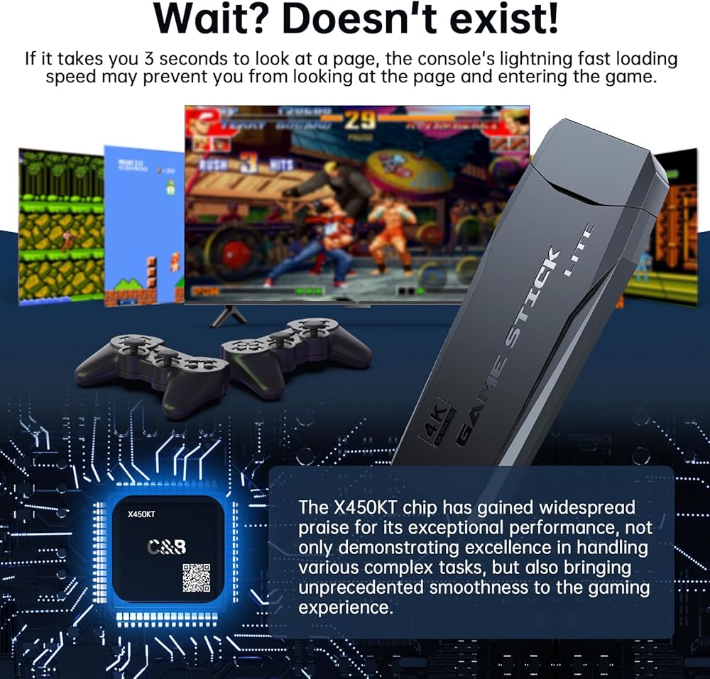 • Wait? Doesn't exist! If it takes you 3 seconds to look at a page, the game stick 4k's lightning fast loading speed may prevent you from looking at the page and entering the video games. Don't worry, the game stick you want to play can be searched for archives with one click, and supports up to 128G TF card expansion, so you have enough space to save your favorite games