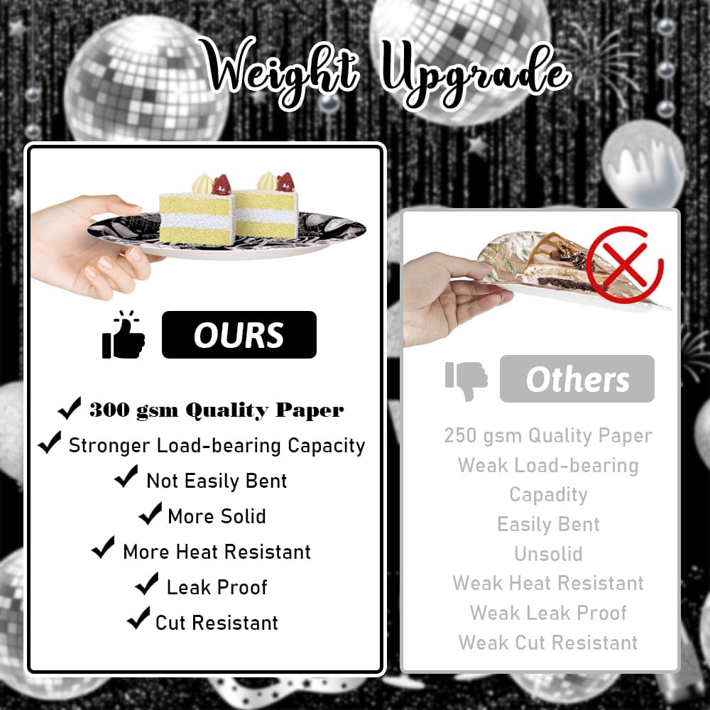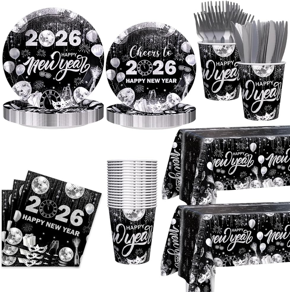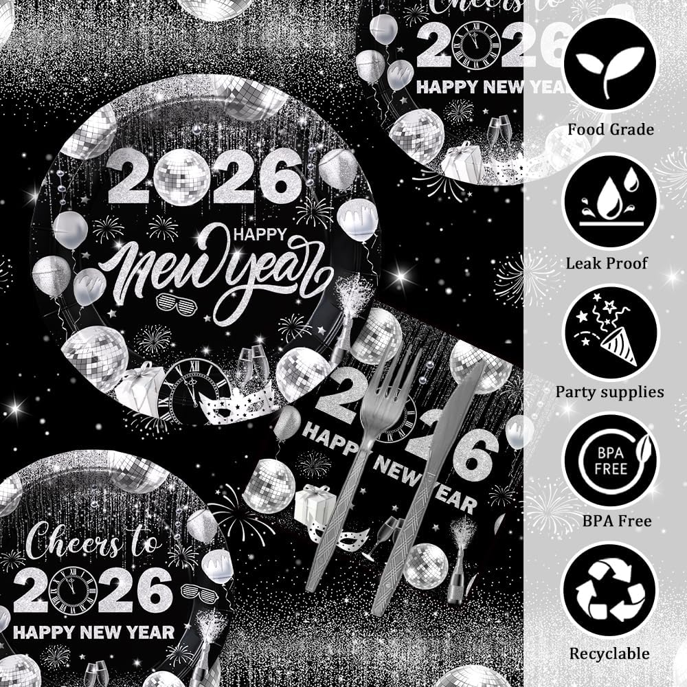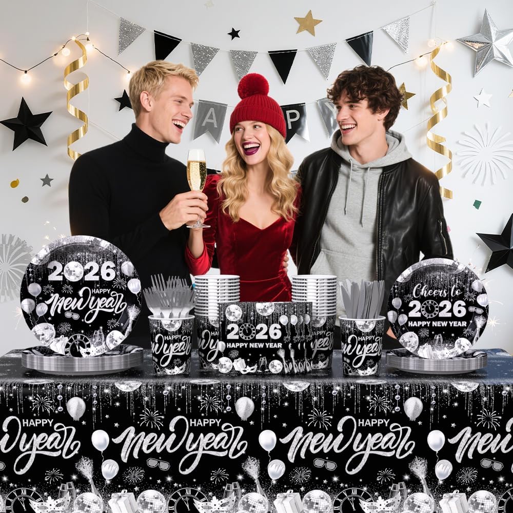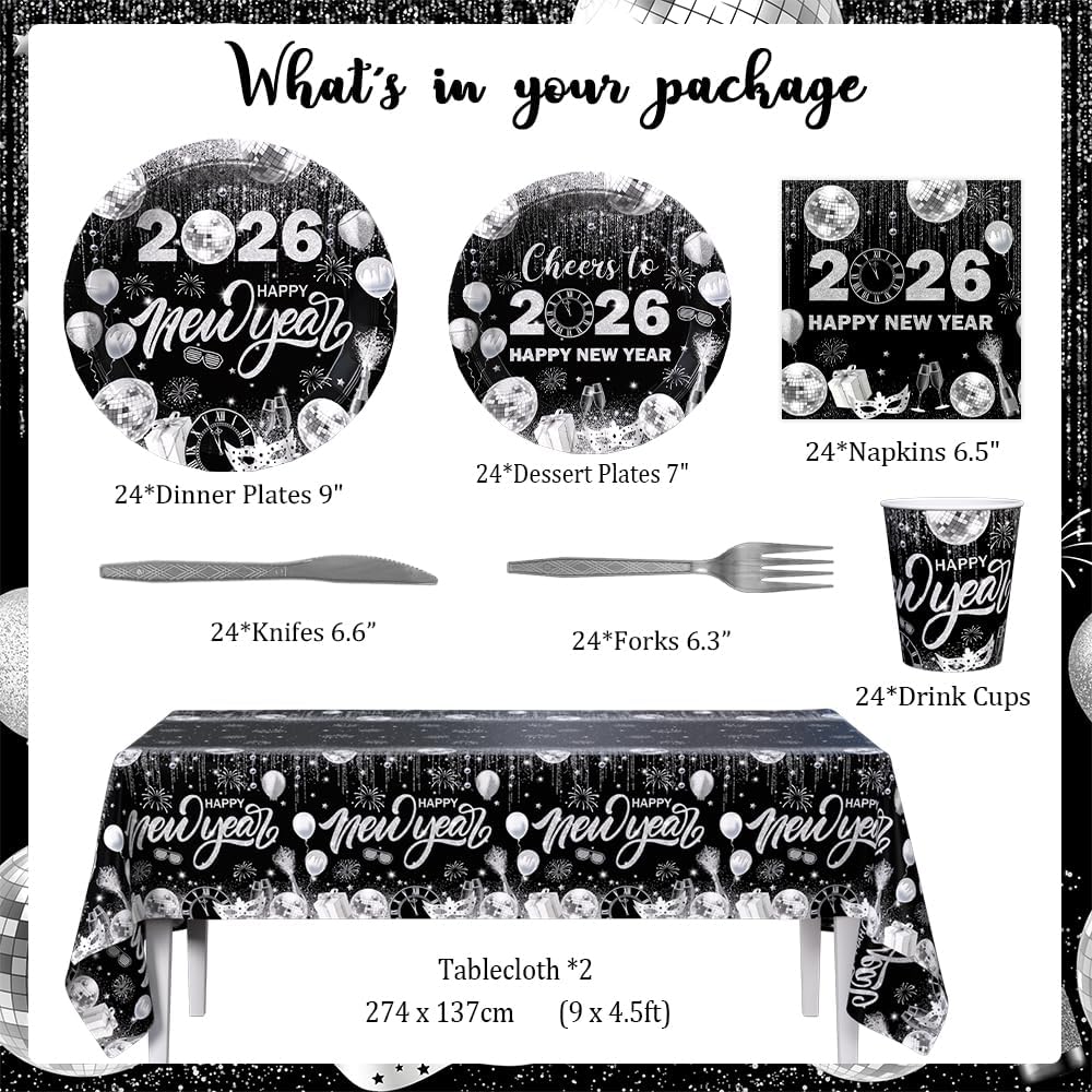 194pcs Happy New Years Eve 2026 Party Decorations for New Year Party Plates, Cup, Napkin, Tablecloth, Tableware, Black Silver Disco Disposable Party Supplies Plates Serve 24 Guests