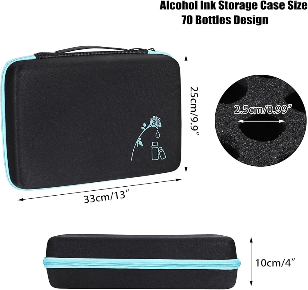 【Large Capacity】Dimensions(LxWxH): 13" x 9.9" x 4". Fits bottles up to 1 inch wide and 3 inches tall. The alcohol ink storage case fits up to 70 bottles of your favorite ink or paint. Fits (5ml,10ml,15ml) popular ink, paint and essential oil bottles