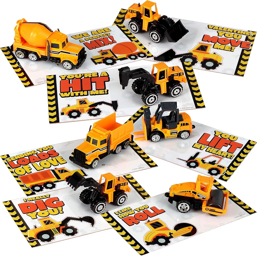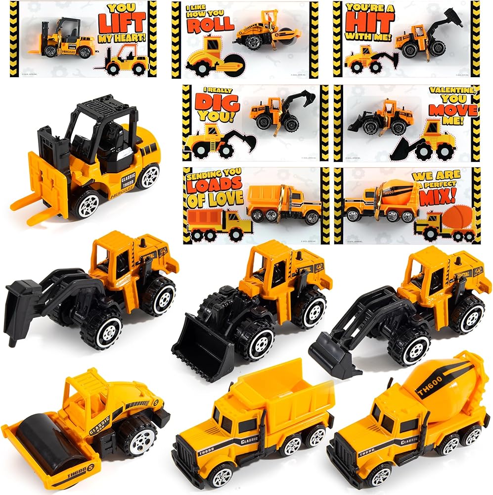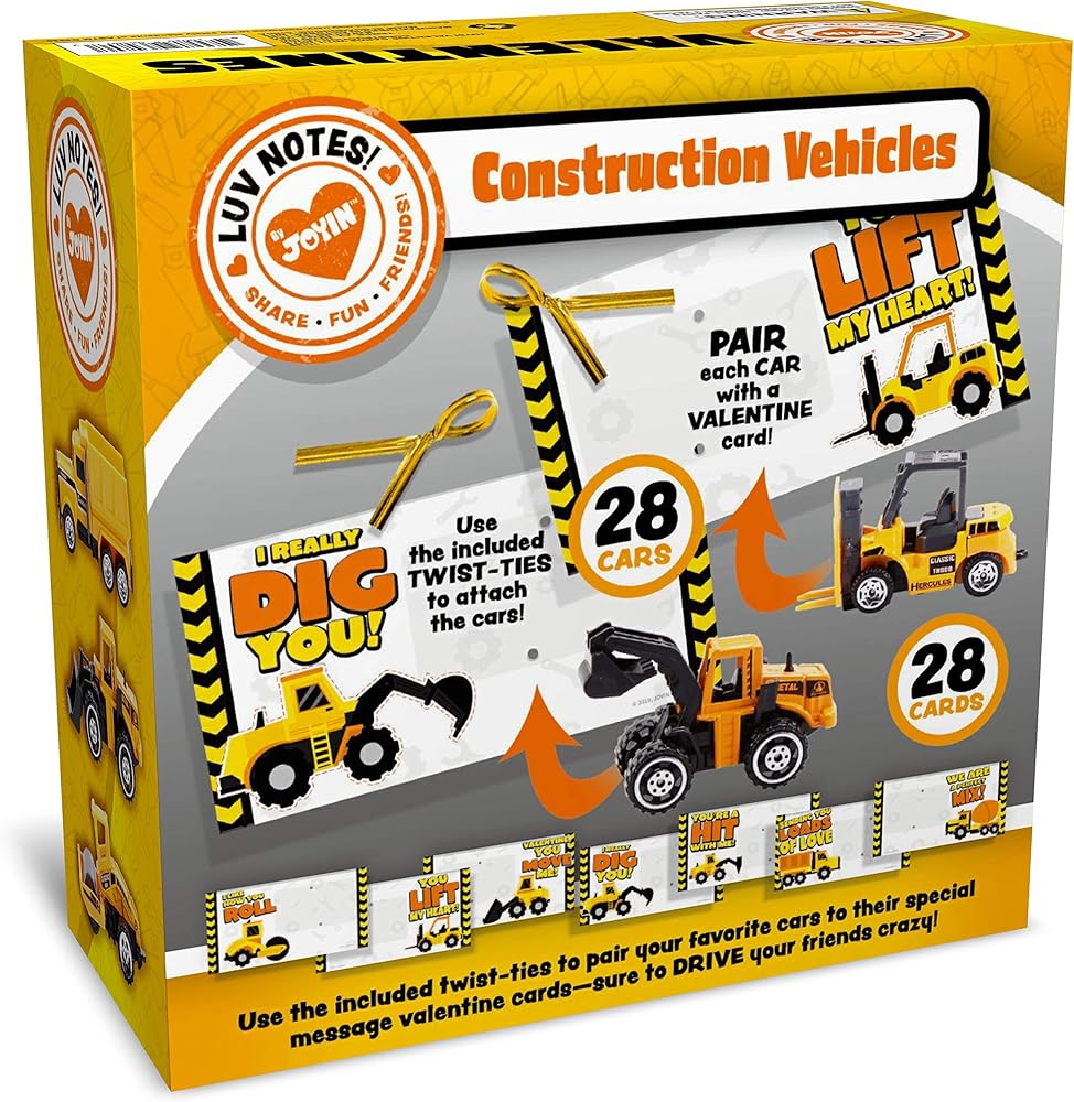 SUPER VALUE PACK. Our Construction Vehicle Set Valentine's Day Cards includes 28 valentine's cards with cute, humorous messages that uniquely match the mini vehicles. There are 7 designs of the truck set, includes excavator toy, pile rigger, front loader truck, forklift toy, roller, dump truck, and cement mixer truck.
