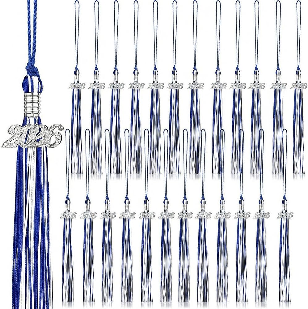 24 Pieces Graduation Tassels with 2026 Year Date Charms Grad Graduation Cap Tassel Decoration for 2026 Party Gifts Activities, 16.2 Inch(Royal Blue, White, Silver)