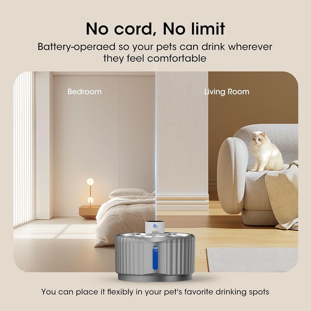 Wireless Cat Water Fountain, 95 oz/2.8 L Battery Operated Pet Water Fountain for Cats Inside, Automatic Dog Water Fountain with Stainless Steel Tray, Motion Sensor, Quiet Pump (Grey)