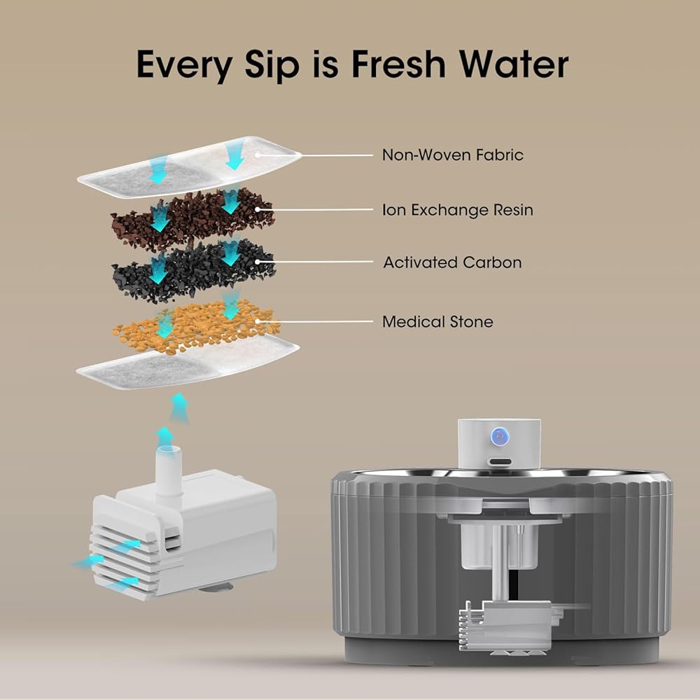 Every Sip is Fresh Water: 1.Activated carbon removes bad taste and odor 2.Ion exchange resin could soften the tap water 3.Medical stone removes heavy metals and releases trace elements 4.Non-woven fabric could filter hair and impurities 5.The high-density sponge of pump helps remove fine particles. Purifying water quality, pets can drink water without worry