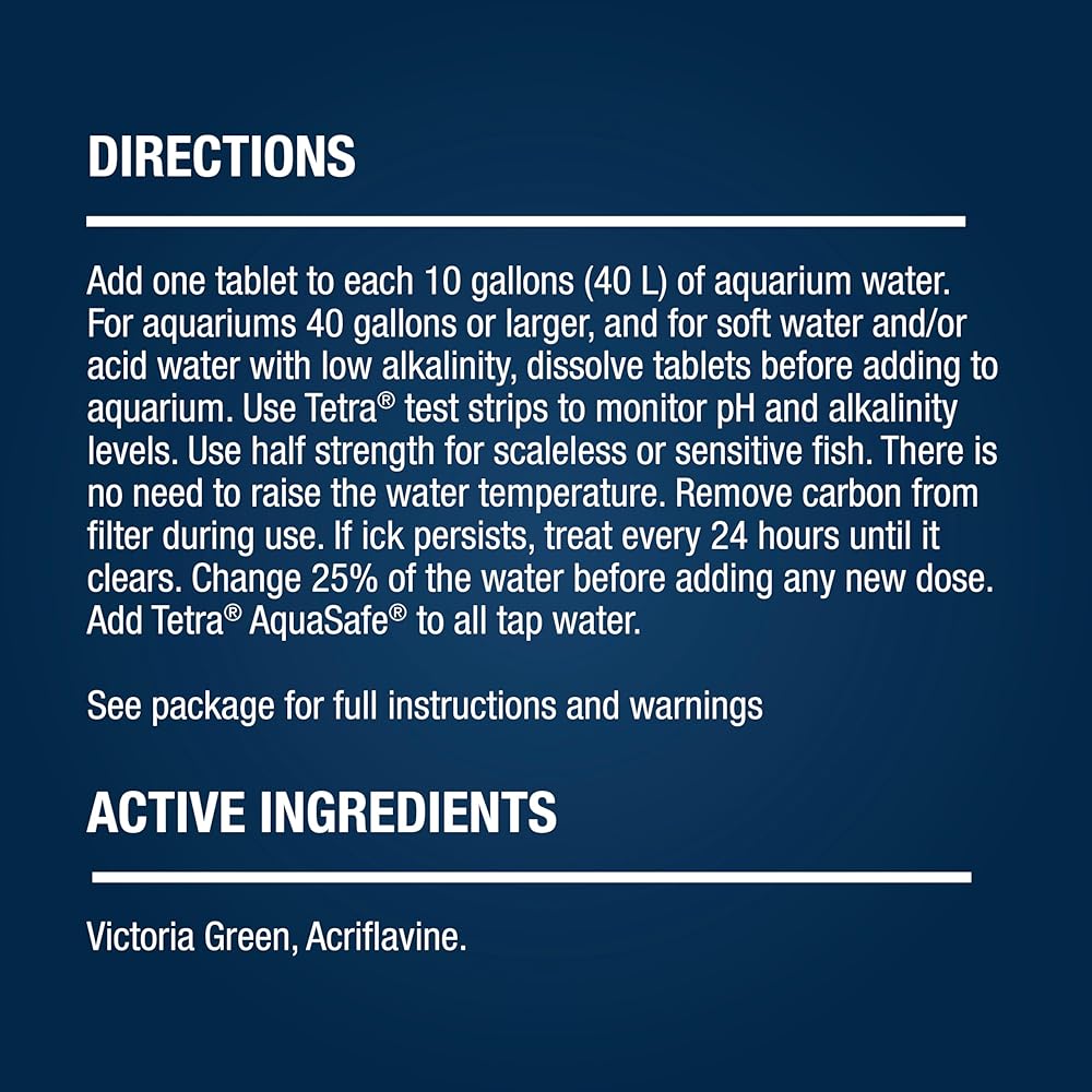 For 50 years, fishkeeping enthusiasts have looked to the Tetra name for products and solutions that add ease and beauty to their home. Whether you're an experienced hobbyist or just starting out, Tetra has everything you need–-from a large variety of quality fish food and innovative equipment to test kits and decor. Tetra Ick Guard is a soothing conditioner that quickly clears ick (Ichthyophthirius multifiliis), or white spot, on freshwater fish. Ick is usually the result of sudden changes in the aquarium water temperature or stress. Left untreated, ick spreads rapidly and is usually fatal. Special ingredients have been added to protect fish from secondary infections. Tetra Fizz Tabs are fast dissolving premeasured tablets that make caring for your aquarium faster, easier, and more convenient. Use this remedy without having to raise water temperatures in your aquarium.