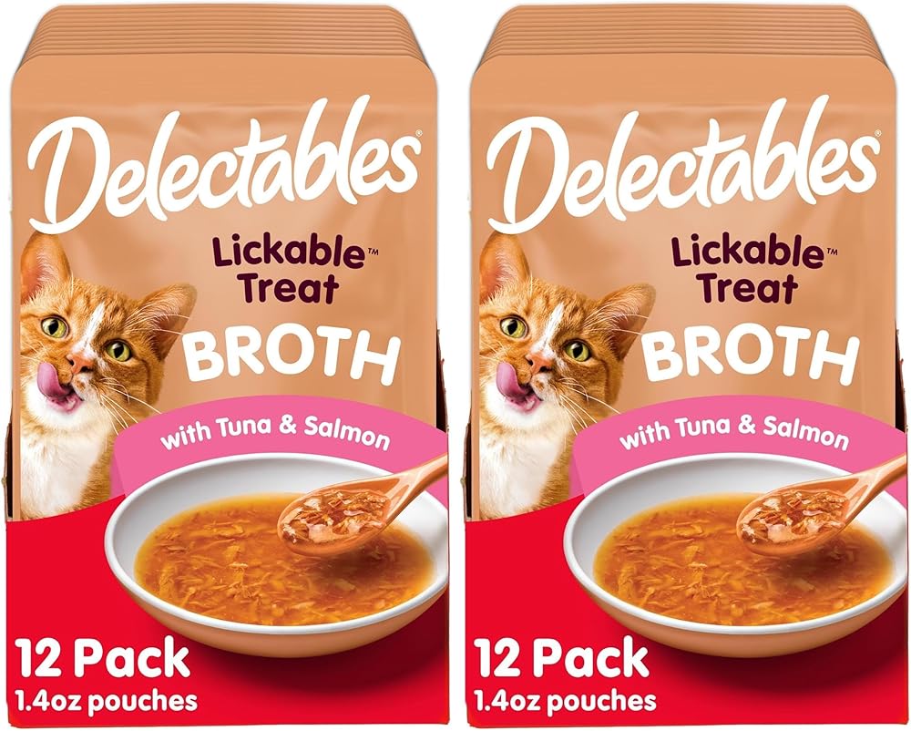 Delectables Savory Broths Lickable Treat has a unique wet texture that combines real ingredients with a rich and savory broth, even the most finicky cats will be begging for more! This nutritious and hydrating new wet cat treat entangles the meat and the sauce together so your cat can lick up both the sauce AND the meat, without leaving any meat behind. These versatile lickable cat treats can be used as a food topper, a quick snack, or a special treat – all these uses will have your cat loving you back! This pack includes twelve (12) 1.4-ounce single serving pouches of pure kitty satisfaction. Delectables Lickable Treats are available in a Stew, Bisque, Chowder & Soft Pate texture in a wide variety of flavors for each and every kitty!