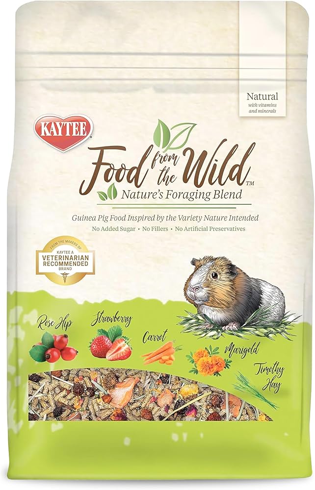 Inspired by the ancestral feeding habits of guinea pigs, Food From the Wild blend is crafted with hand-selected timothy hay, rose hip, carrot, marigold, and strawberry to encourage the healthy foraging activity your guinea pig needs. Pelleted pieces offer comprehensive nutrition and contain natural probiotics to support digestive health. Food From the Wild blend contains nutritious and tasty ingredients to meet the unique dietary needs of your guinea pig and has no added sugar, fillers, or artificial preservatives. With more than 150 years of nutritional excellence, Kaytee is honored to be at the heart of your healthy, happy feeding routine.