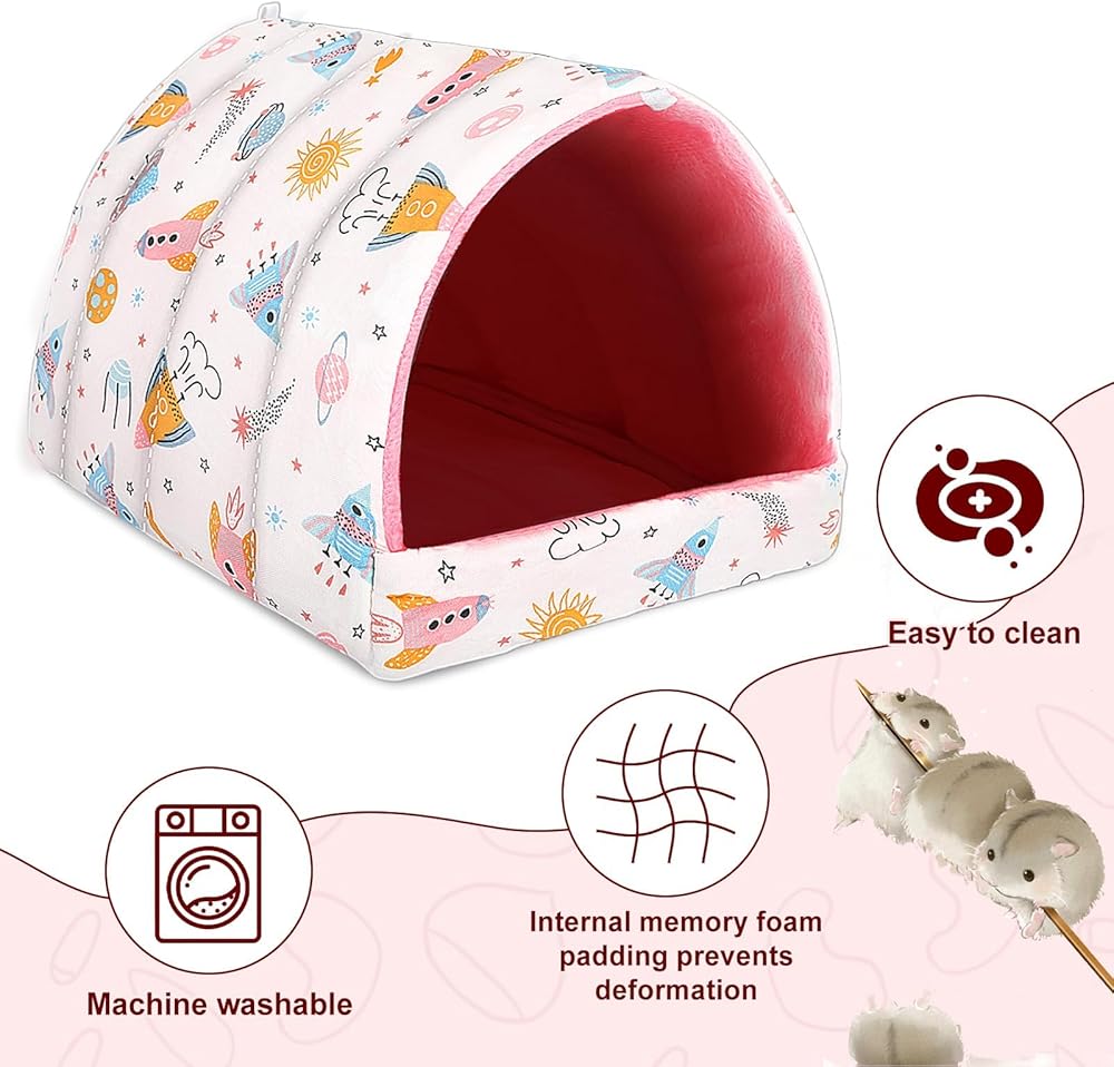 Friendly Design: Adopting grey and dark blue, the mouse house is not easy to get dirty,very practical to use, with bright and beautiful patterns. The integrated design avoids accessories from slipping out and can also protect the claws of small animals from being caught. The thickened inner cushion makes the Guinea pig bed stand upright and not easily deformed