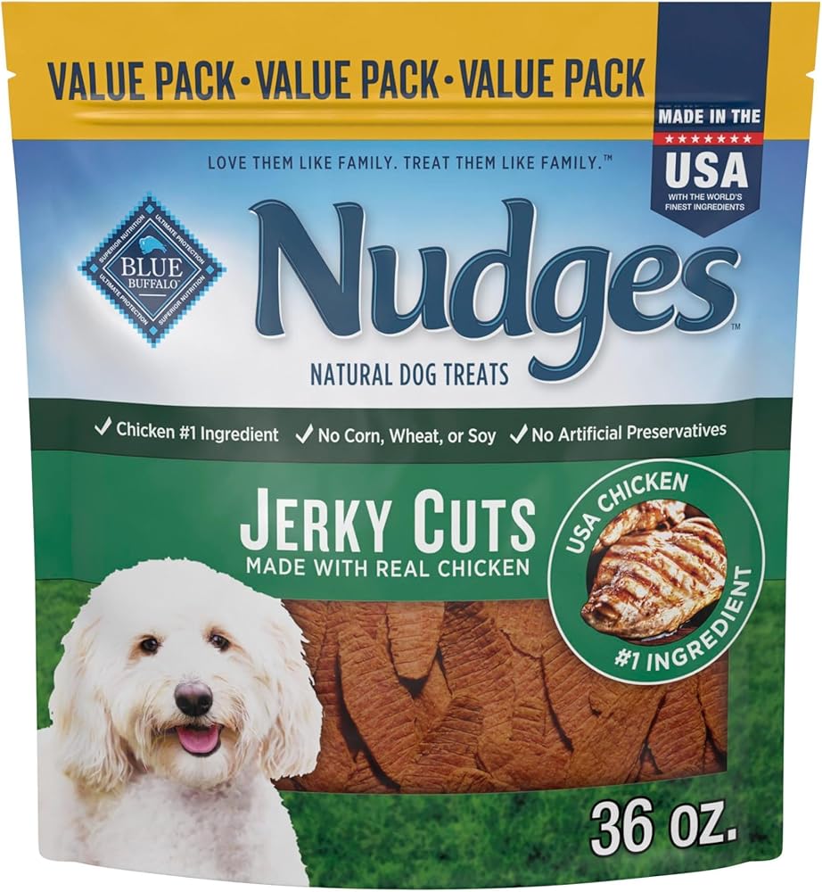 PACKAGING MAY VARY: Contains One (1) 36oz bag of BLUE Nudges Jerky Chews Natural Dog Treats, Chicken
