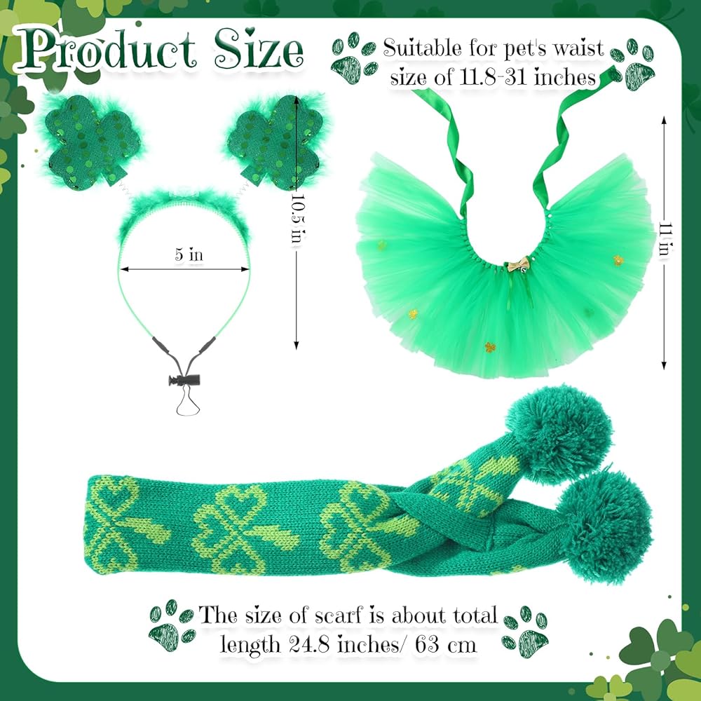 Ideal Combination and Right Sizes: our St Patrick's Day dog costume set includes 1 pieces of St Patrick's Day scarf for dogs, 1 pieces of dog skirts and 1 pieces of shamrock headbands; The headband is suitable for dogs whose head circumference is greater than 12 inches; The dog tutu with ribbon measures approx. 7.9 inches/ 20 cm, suitable for pet's waist size of 11.8-31 inches; The size of scarf is about total length 24.8 inches/ 63 cm; Please check the size before buying