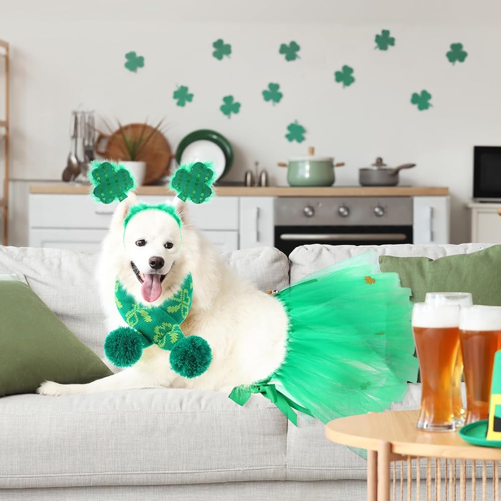 3 Pcs St Patrick's Day Dog Costume Set Including Sequins Shamrock Headband St. Patrick's Day Dog Tutu Dress Cute Pet Tutu Green Irish Pet Scarf for Medium Dogs Holiday Outfit Accessory