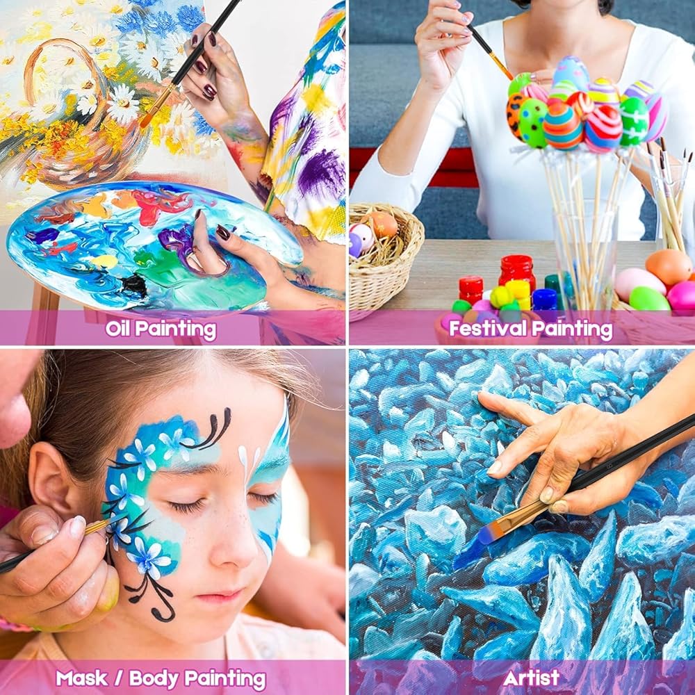 Awesome Set of Paint brushes: Professional paint brushes can cover all of your needs. The multi-purposed brushes are ideal for Watercolor, Oil, Gouache, enamel, Acrylic Painting, Body, Nail, Face Painting, Miniature, Model, Wood, Glass, Cup, Ceramic, Fine work, Art class, Craft Art Painting, DIY Art Crafts etc.