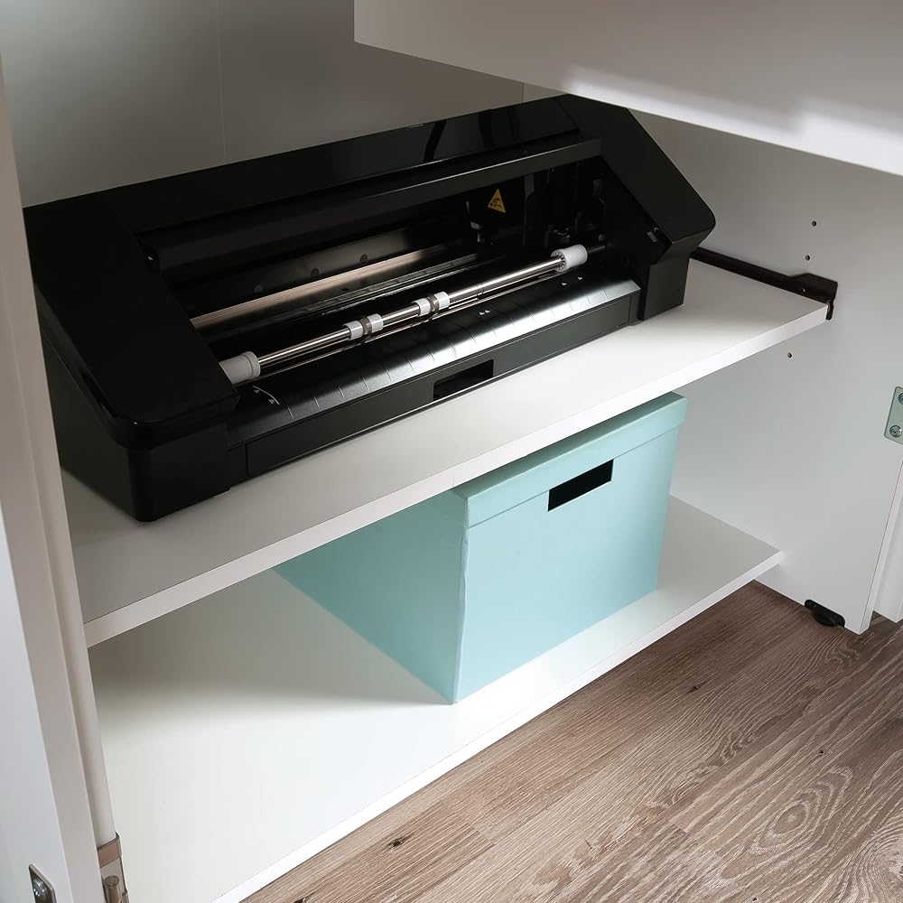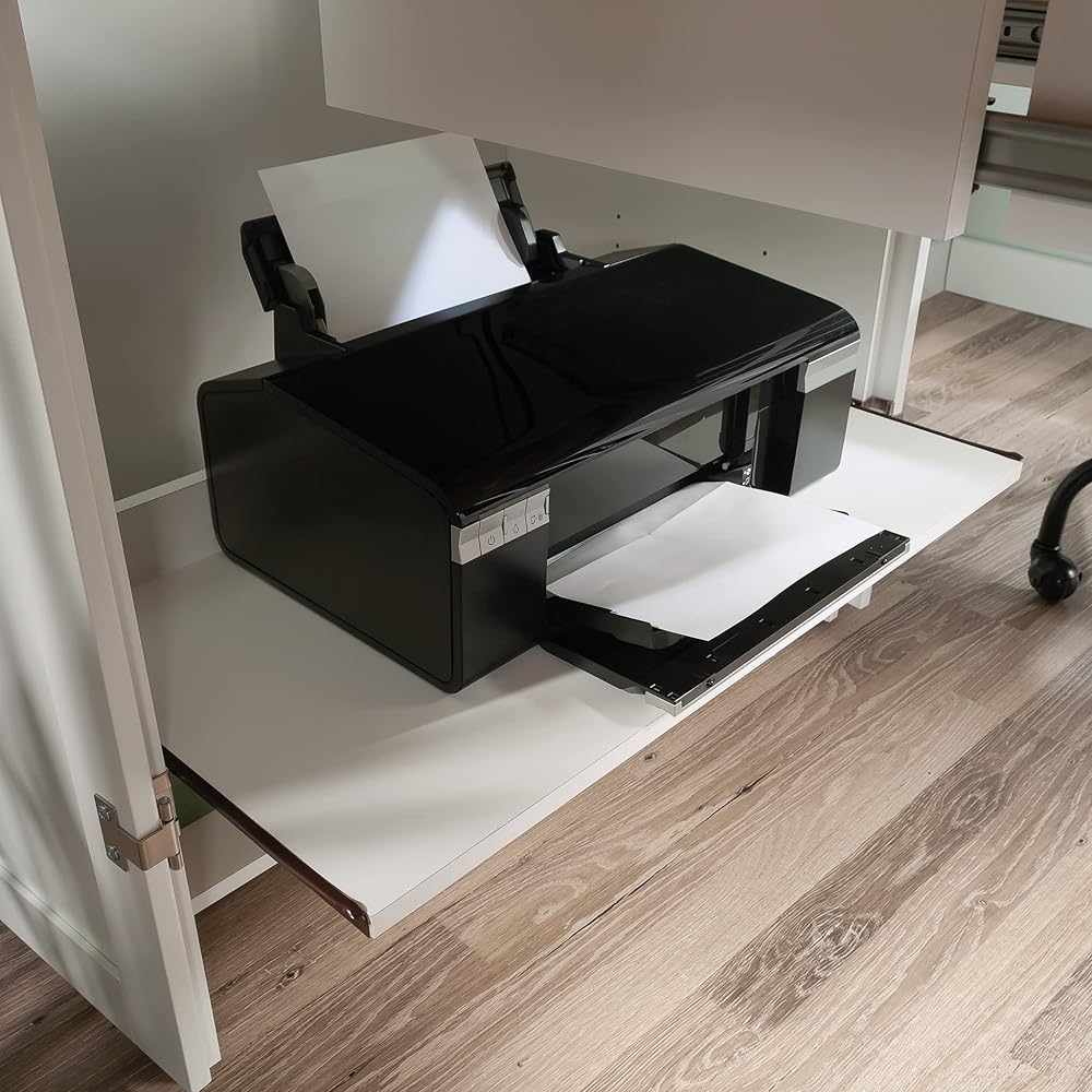 - SLIDE-OUT CONVENIENCE: Lower shelf with metal runners perfect for a printer or storage bins