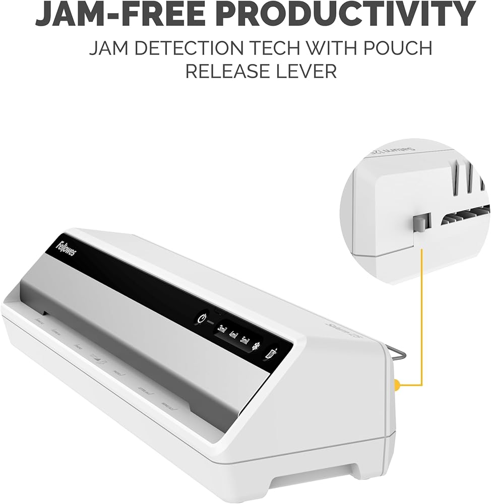 Jam-Free and Easy To Use: Fellowes laminators come equipped with a jam release level that allows you to easily disengage pouches for re-centering or removal