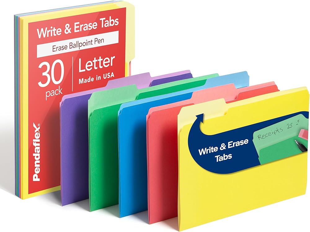 Use the same folders over and over using a ballpoint pen and erase with a pencil eraser; ideal for home, school and office organization