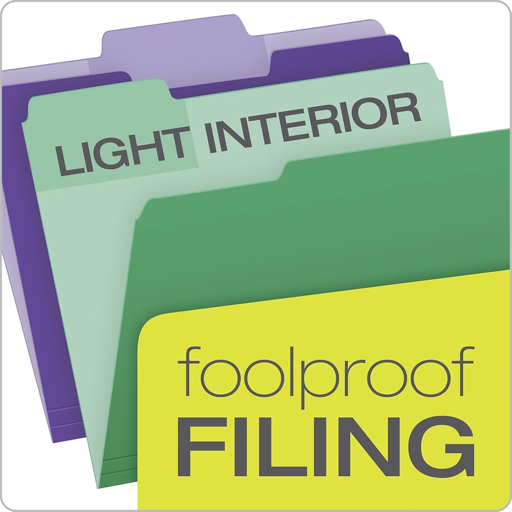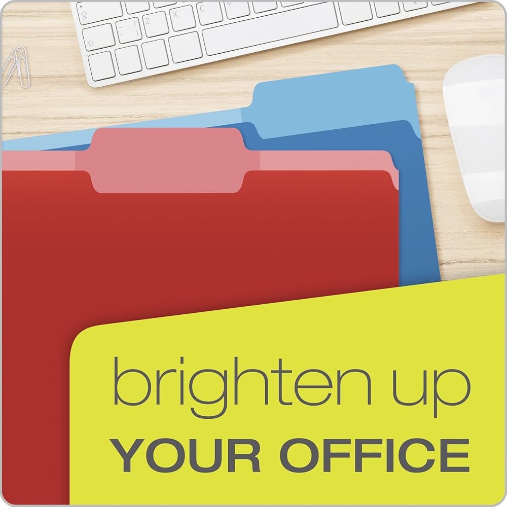 11 point, assorted color folders with lighter interior to prevent misfiles; perfect for letter size sheets and documents