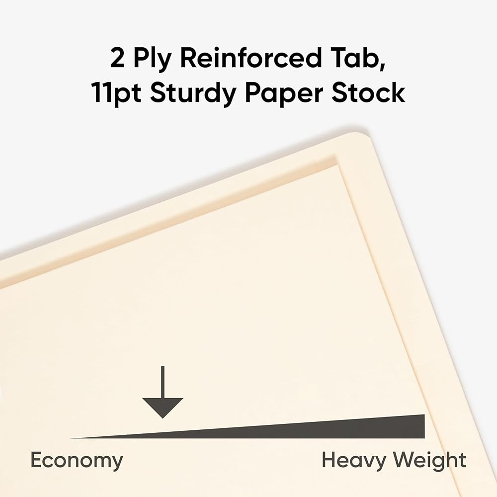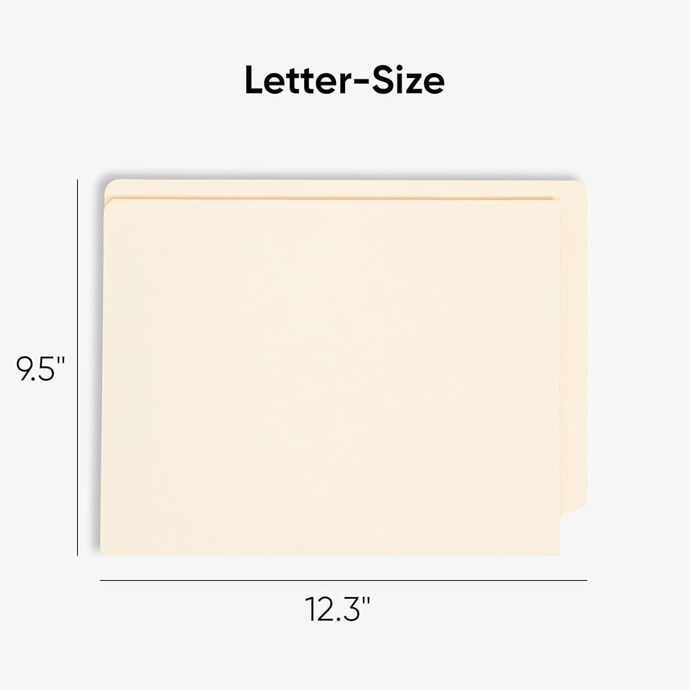 11 pt. manila stock. Tab 3/4-inch wide, embossed for label. 9-inch x 5-3/4-inch pocket on inside front. 2-inch prong B-style fastener in position 1. Smead 100 Years of Excellence.