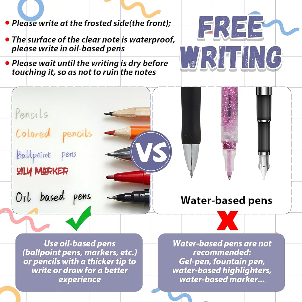 Warm Reminder: since the transparent note pads are made of waterproof material, it's recommend that you use oil based pens, ballpoint pens, oily markers or pencils, instead of water based pens (gel pen, fountain pen, water based highlighters, water based marker and so on) to write or draw for a nice using experience; Please wait until the writing is dry before touching it