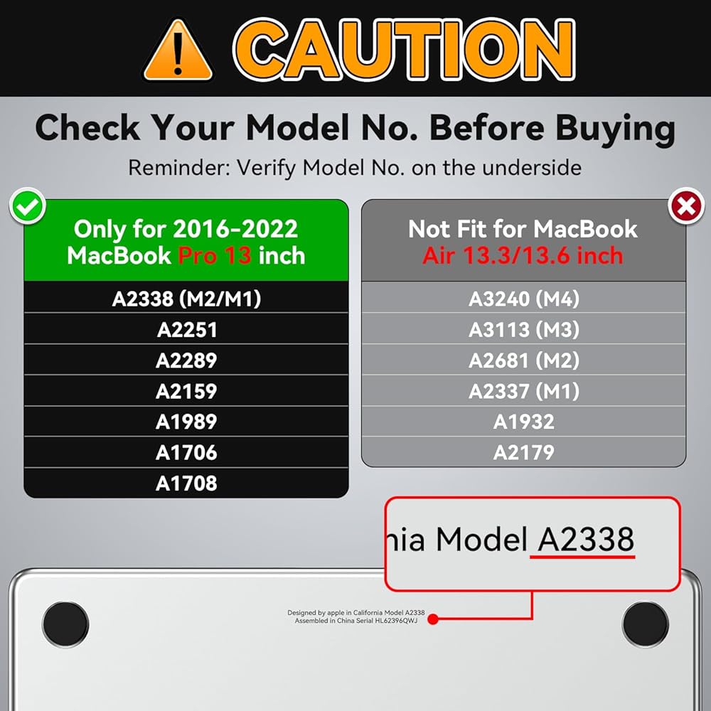 Check Your Model: Only compatible with MacBook Pro 13 inch 2025 2024 2023 2022 2021 2020 2019 2018 2017 release (Models: A2338 M2/M1 A2289 A2251 A2159 A1989 A1706 A1708). Please kindly check the model number "AXXXX" on the back of the laptop before your purchase