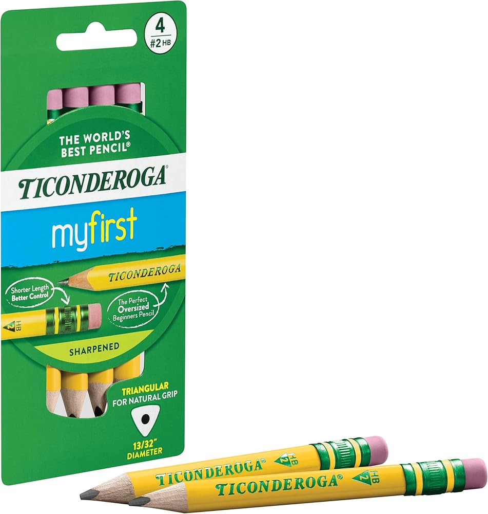 You've asked for short pencils for kids, and now the perfect sized pencil for young students is finally here; 4.5" length delivers better control and promotes a more natural grip. Triangular shaped, oversized pencil (13/32”) is ideal for children in the early stages of their writing development. It is easy for small hands to hold and helps teach correct pencil grip, or for mature hands to aid in a steady grip. With a rich history of quality spanning over 100 years, Ticonderoga is the trusted brand preferred by teachers. The same spirit of ingenuity that fueled the creation of the very first Ticonderoga pencil continues to inspire innovation in our product line. From latex-free erasers and ergonomically designed triangular pencils to specialty pencils featuring stylish form to match function, our products consistently deliver a superior experience. ABOUT US: Ticonderoga is part of the Dixon Ticonderoga family of products which includes Prang, Dixon, Pacon, Tru-Ray, UCreate, Fadeless, Classroom Keepers, Bordette, Creativity Street, Spectra, Strathmore, Canson, Daler-Rowney, Lyra, Das, Maimeri, Princeton Artist Brush, and more.