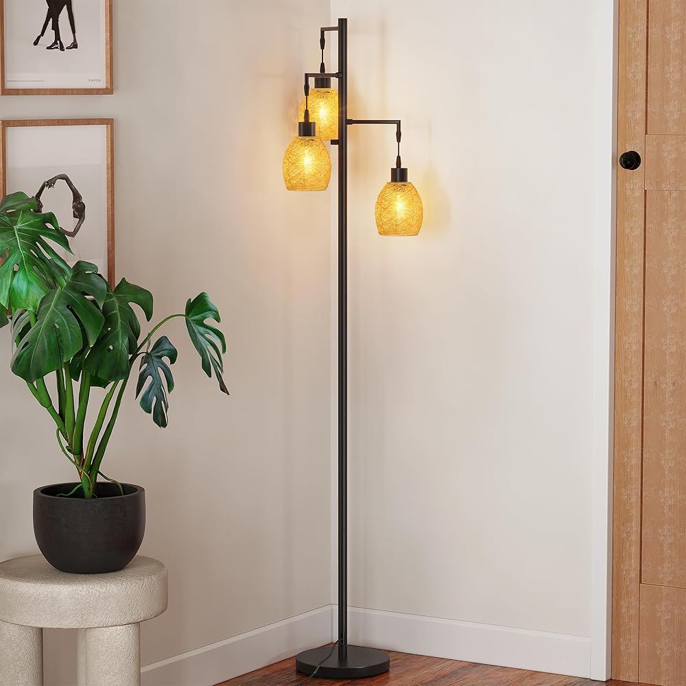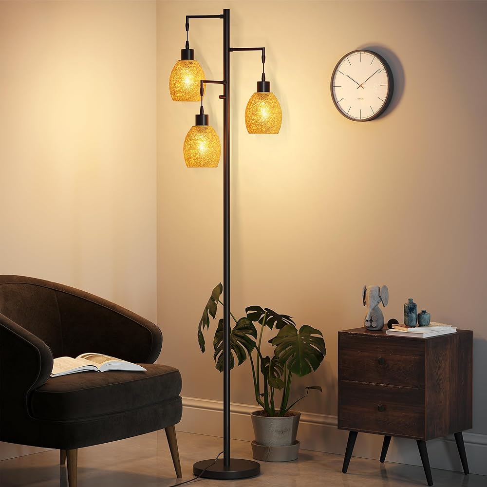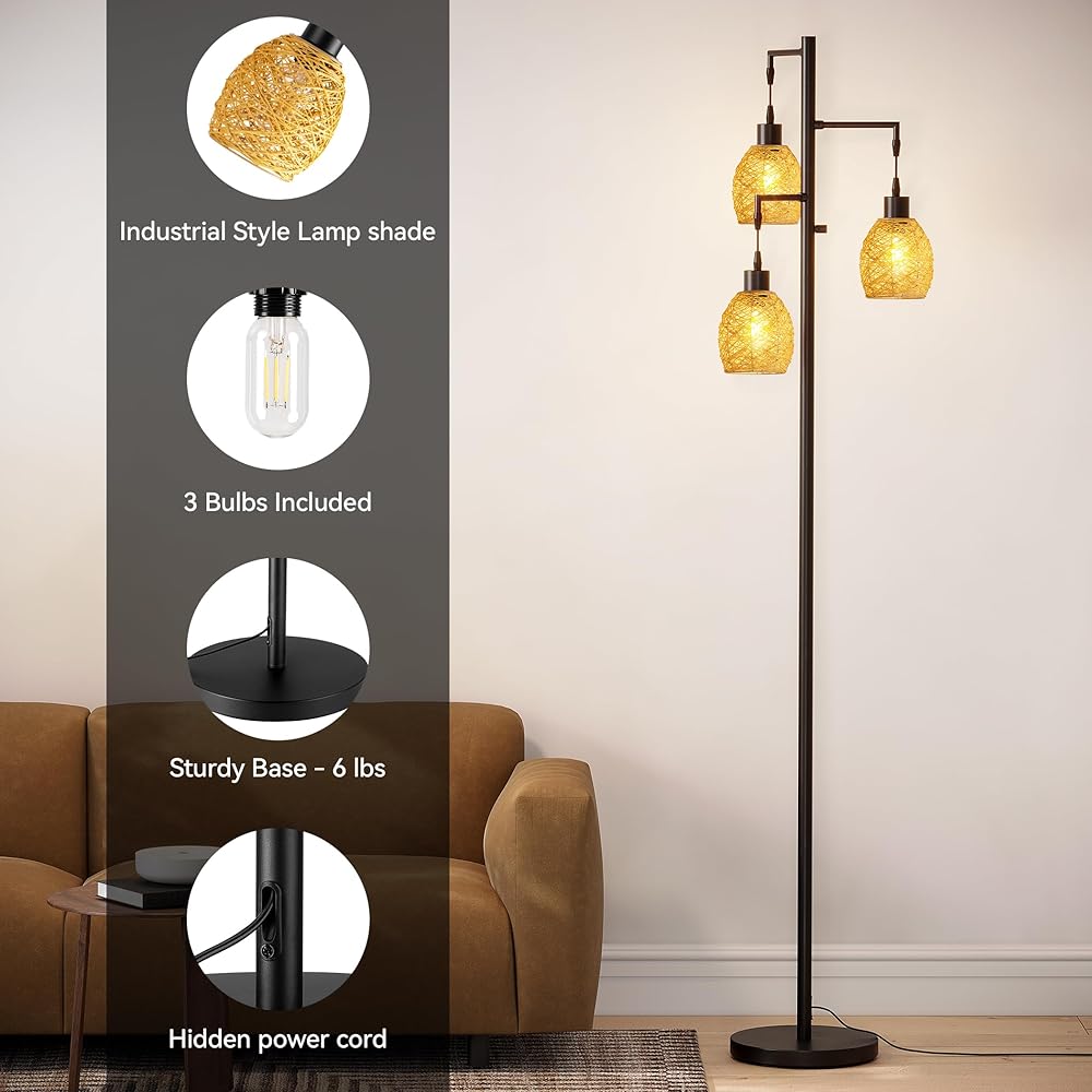 SUNMORY Dimmable Floor Lamp, 68 Inch Tall Lamps for Living Room, Standing Lamp with 3 x 6w LED Bulbs, Tree Lamp, Farmhouse Industrial Floor Lamp for Bedroom, Office, Black & Rattan Shade