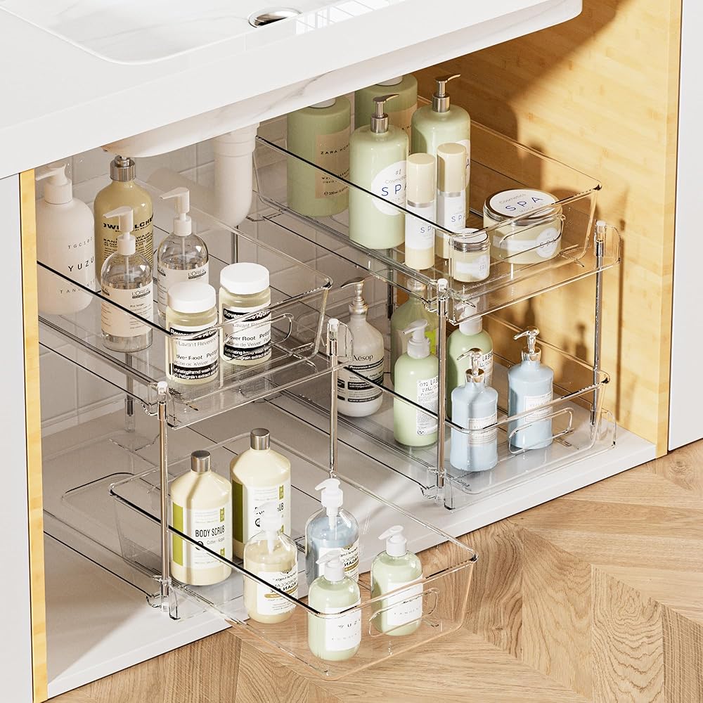 Vtopmart 2 Tier Bathroom Storage Organizer, 2 Pack Clear Under Sink Organizers Vanity Counter Container, Cabinet Drawers Bins, Pull-Out Organization with Track for Pantry, Kitchen