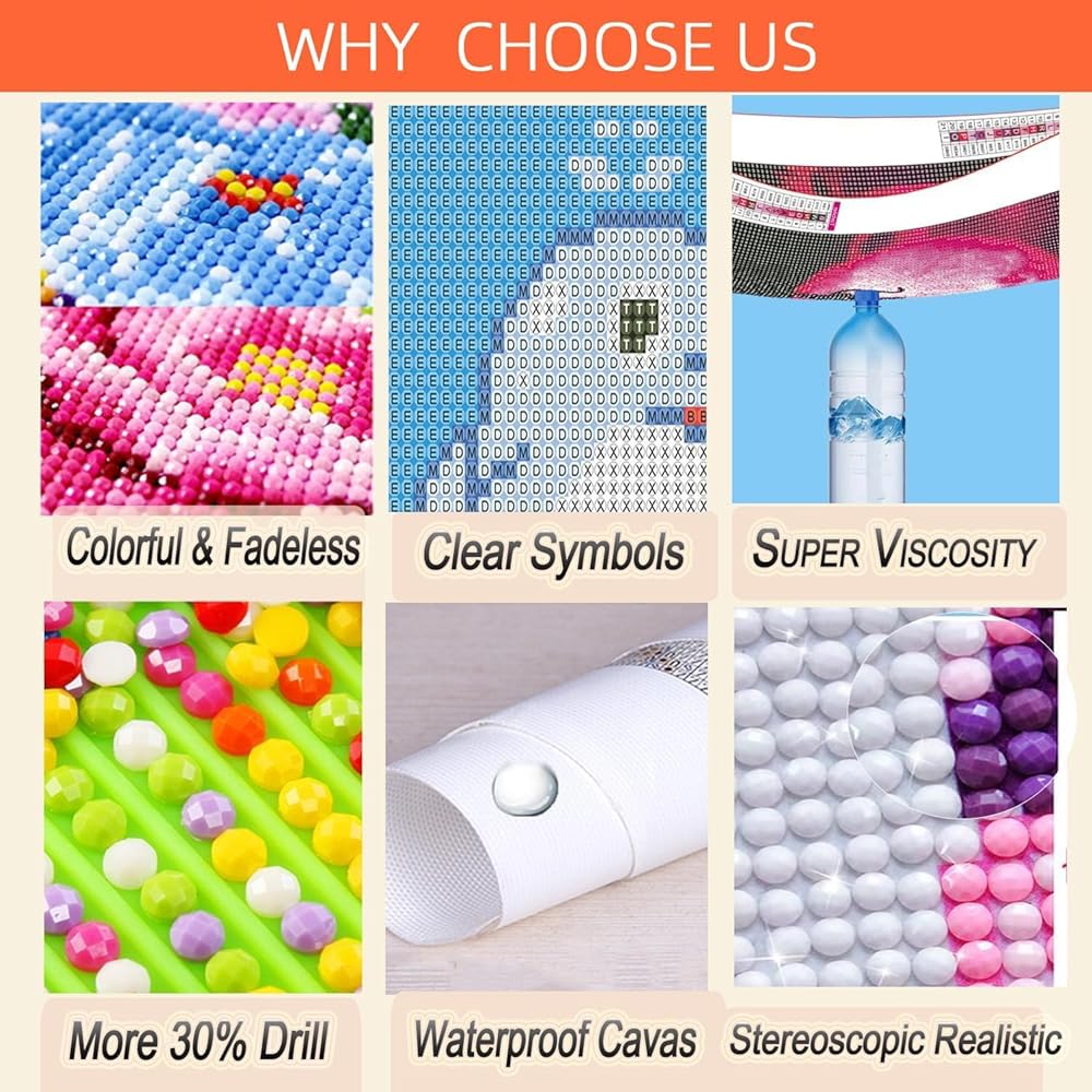 Easy to Read: Diamond art numbers and symbols on the canvas are clear and easy to read. You get about 30% extra beads in every color to prevent the occurrence of insufficient diamonds. The drills adhered to the canvas without difficulty, and the diamonds stays on very good, wouldn't fall off.