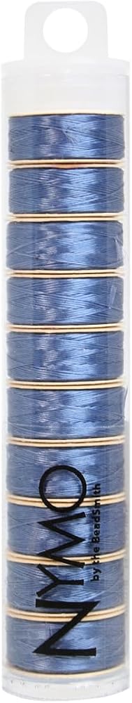BEADING THREAD: This tube contains 10 spools of Nymo in a color assortment which includes 1 each: ash, black, baby pink, cream, golden, grey, light purple, rosy mauve, turquoise and white. The size D thread is a nylon cord. Each spool is .30mm in diameter and 64 yards (58.5 meters) in length.