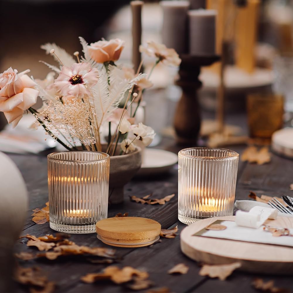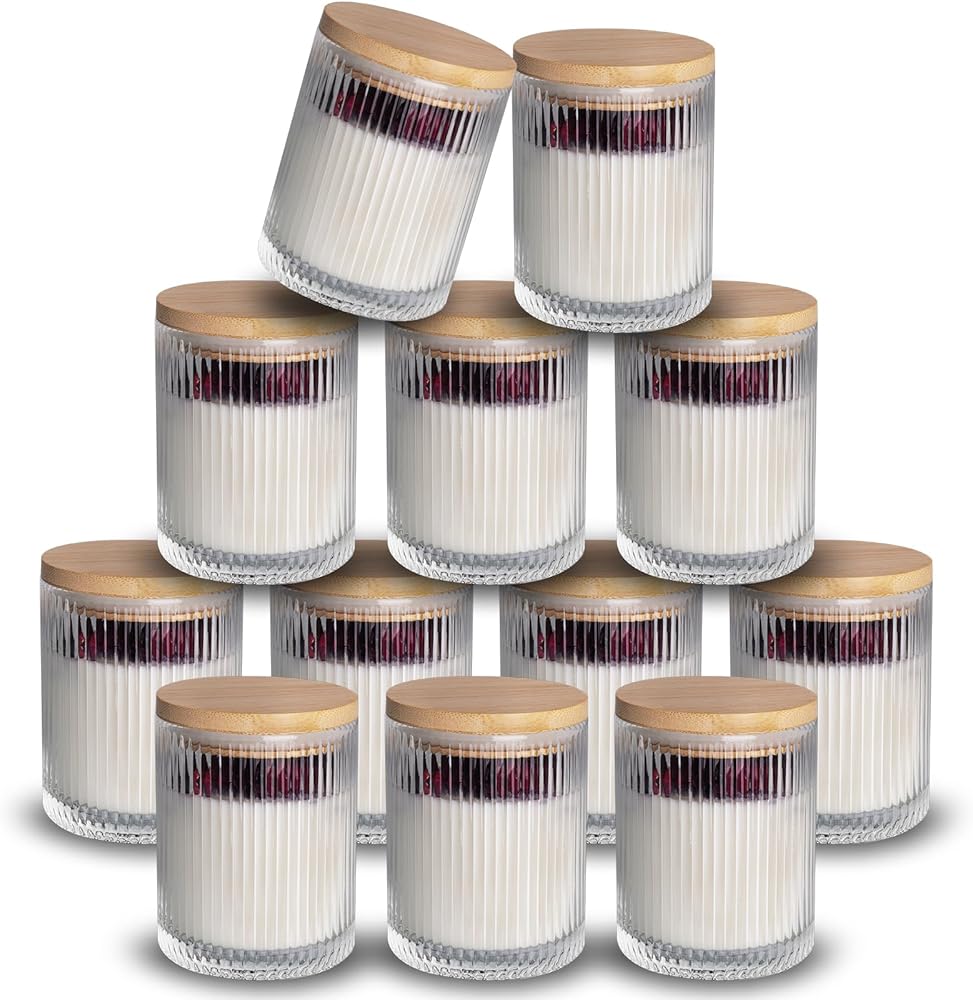 NiHome 12-Pack Glass Candle Jars with Bamboo Lids for Tealight Candles, Spices, Sugar, Cosmetics & More, Embossed Patterns for Candle Making and Storage, Heat-Resistant Glass with Airtight Bamboo Lids