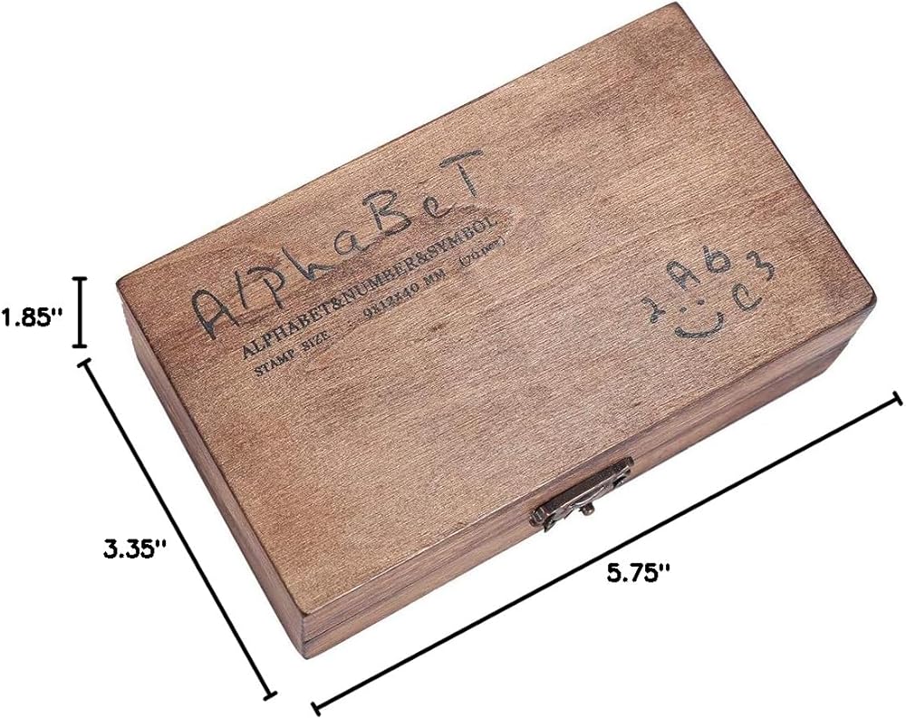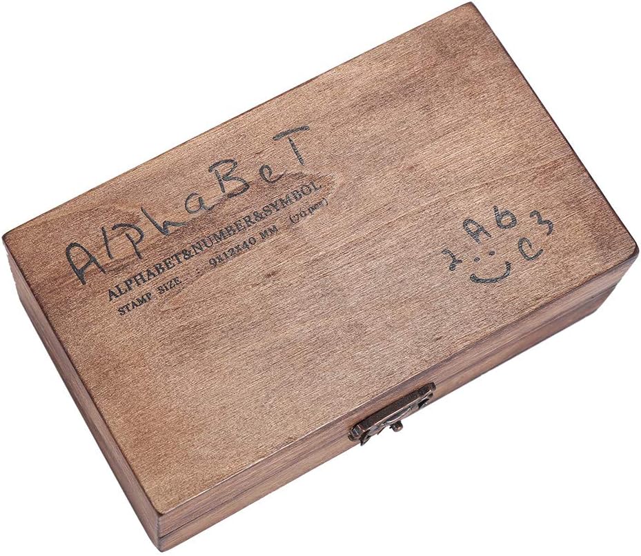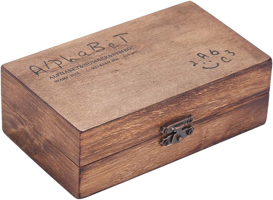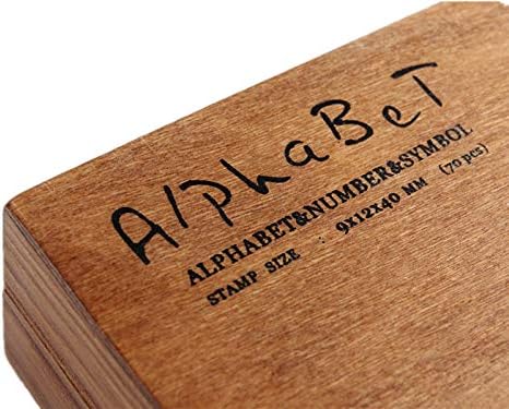 Each wood set contains 70 stamps: 26 upper case regular script alphabet stamps, 26 lower case regular script alphabet stamps, 10 number stamps and 8 symbol stamps.