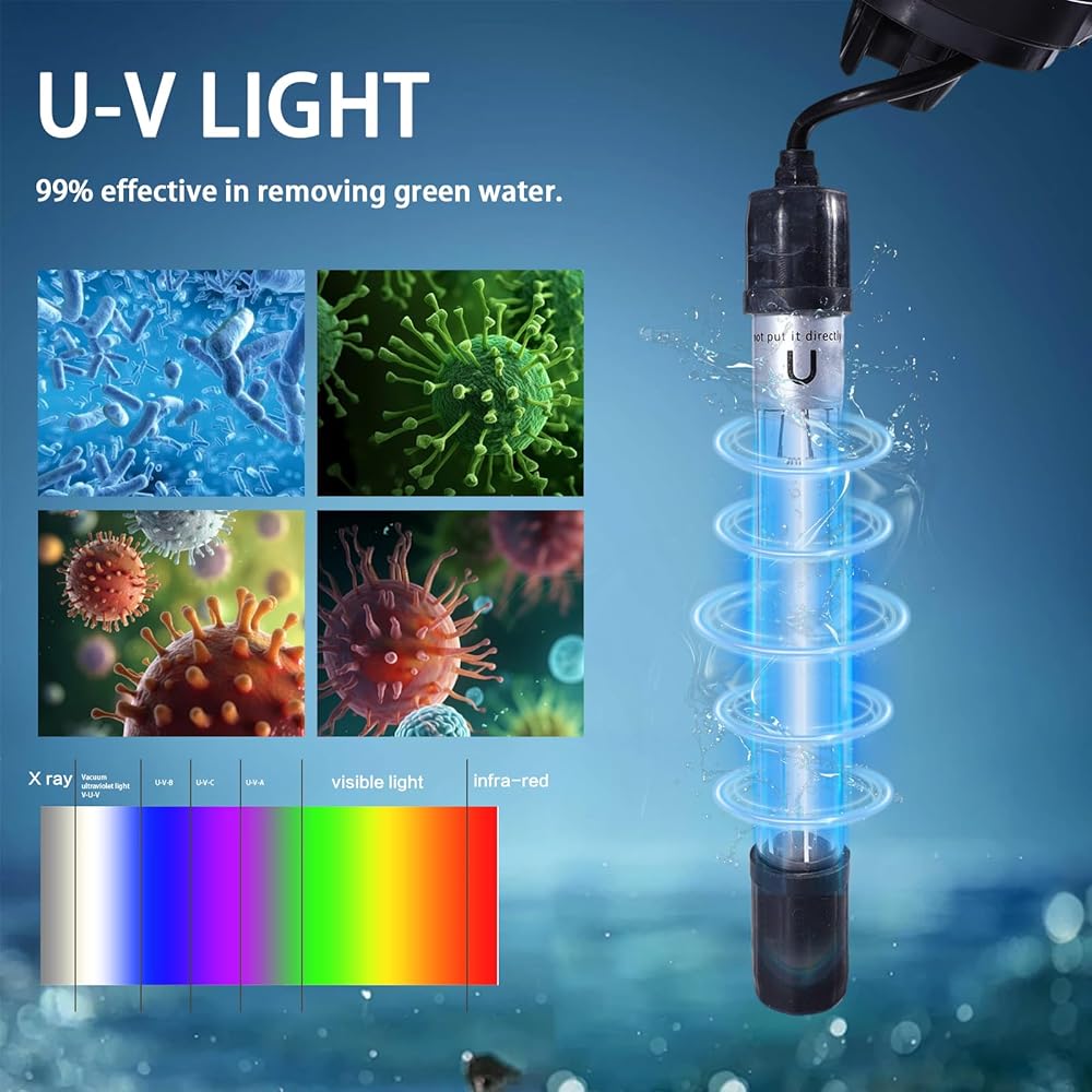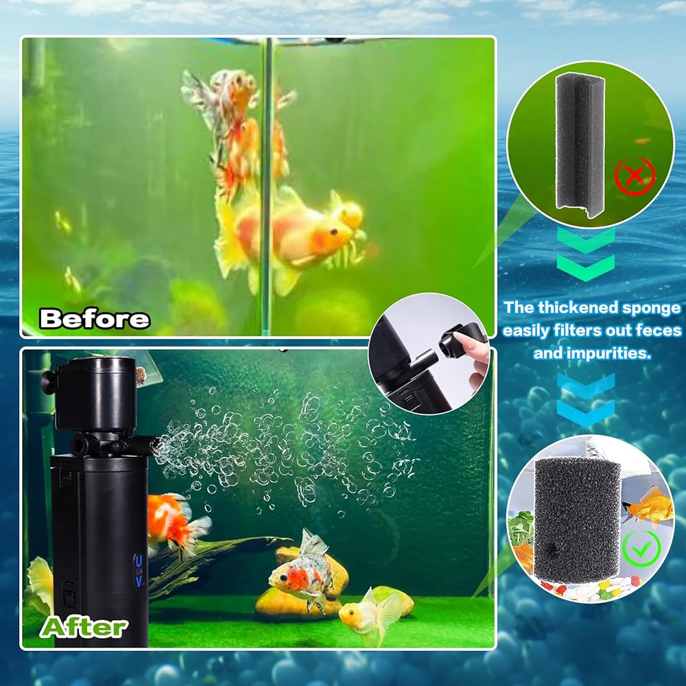 【Dual Filtration System】This aquarium filter combines a black biochemical sponge and a UV light for optimal performance. 1. The black biochemical sponge efficiently filters fish waste and debris, maintaining clean water. 2. The built-in high-efficiency UV light further reduces odors and helps improve water clarity