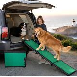 The Pet Gear Reflective Pet Ramp helps your dog maintain confidence when gaining access into your vehicle or other hard to reach places. The ramp's surface features highly visible, reflective material that aids in guiding your pet up and down the extra wide ramp. The tread is skid-resistant, even when wet, keeping your pet steady. Side reflectors maximize safety by increasing the ramp's visibility when in use. Rubber grippers on the bottom of the ramp help it maintain a stable position. The folding design reduces storage space at home or on the go and the carry handle facilitates easy transportation