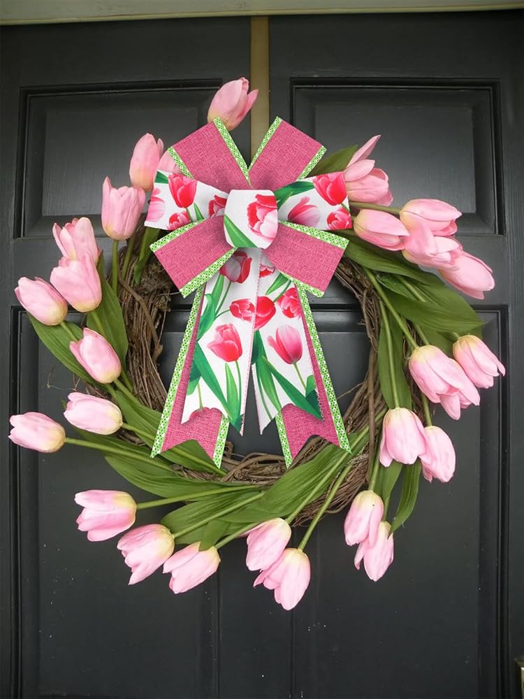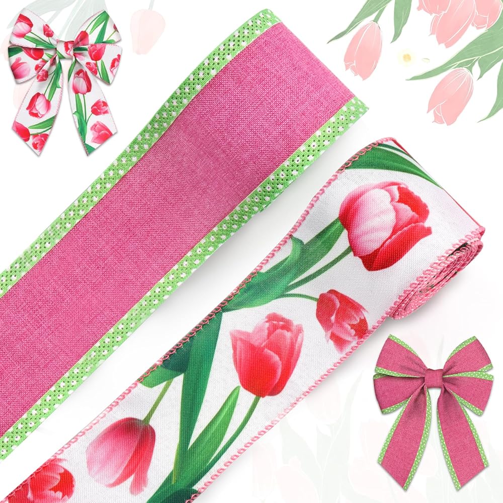 ABTOLS 2 Roll 10 Yards Floral Ribbons, 2.5" Red Tulip Wired Edge Burlap Ribbon Rose Red Dot Ribbon Green Gift Wrapping Ribbon for Spring Party Decor Gift DIY Crafts Wreaths Bow