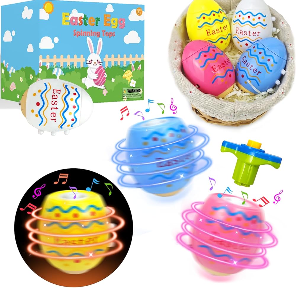 Easter Eggs Basket Stuffers Toys Gifts for Toddler Boys Girls,4 Pack Light up Spinning Tops with Music, Non Candy Spring Easter Egg Hunt Party Favor Supplies Goodie Bag Filler Classroom Prize for Kids