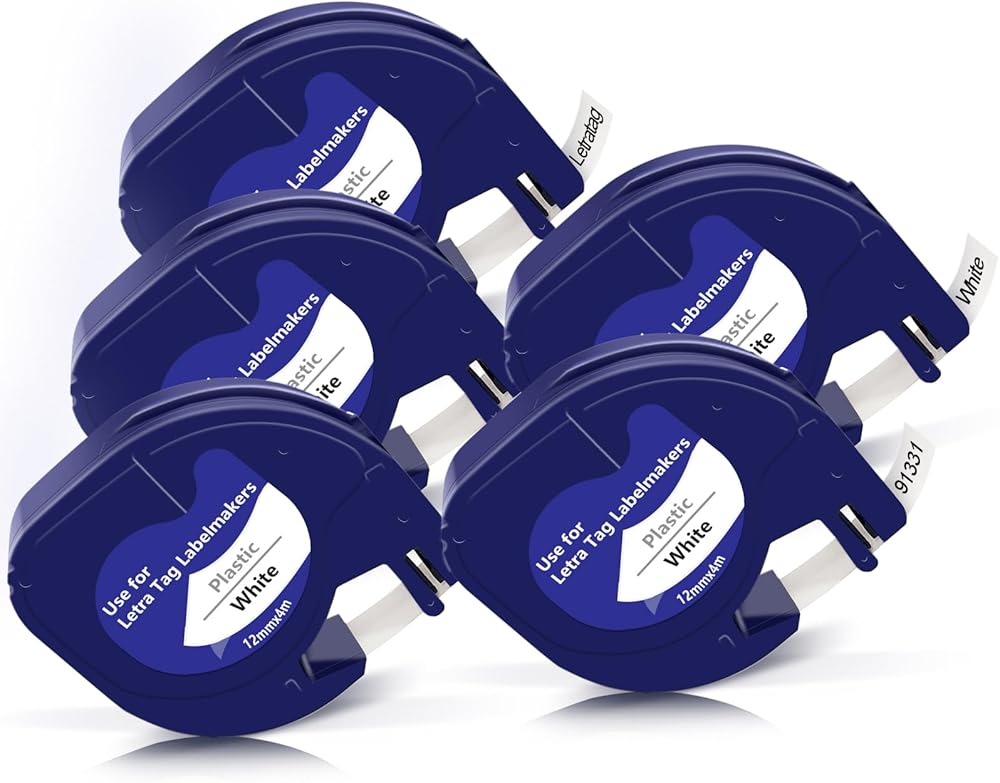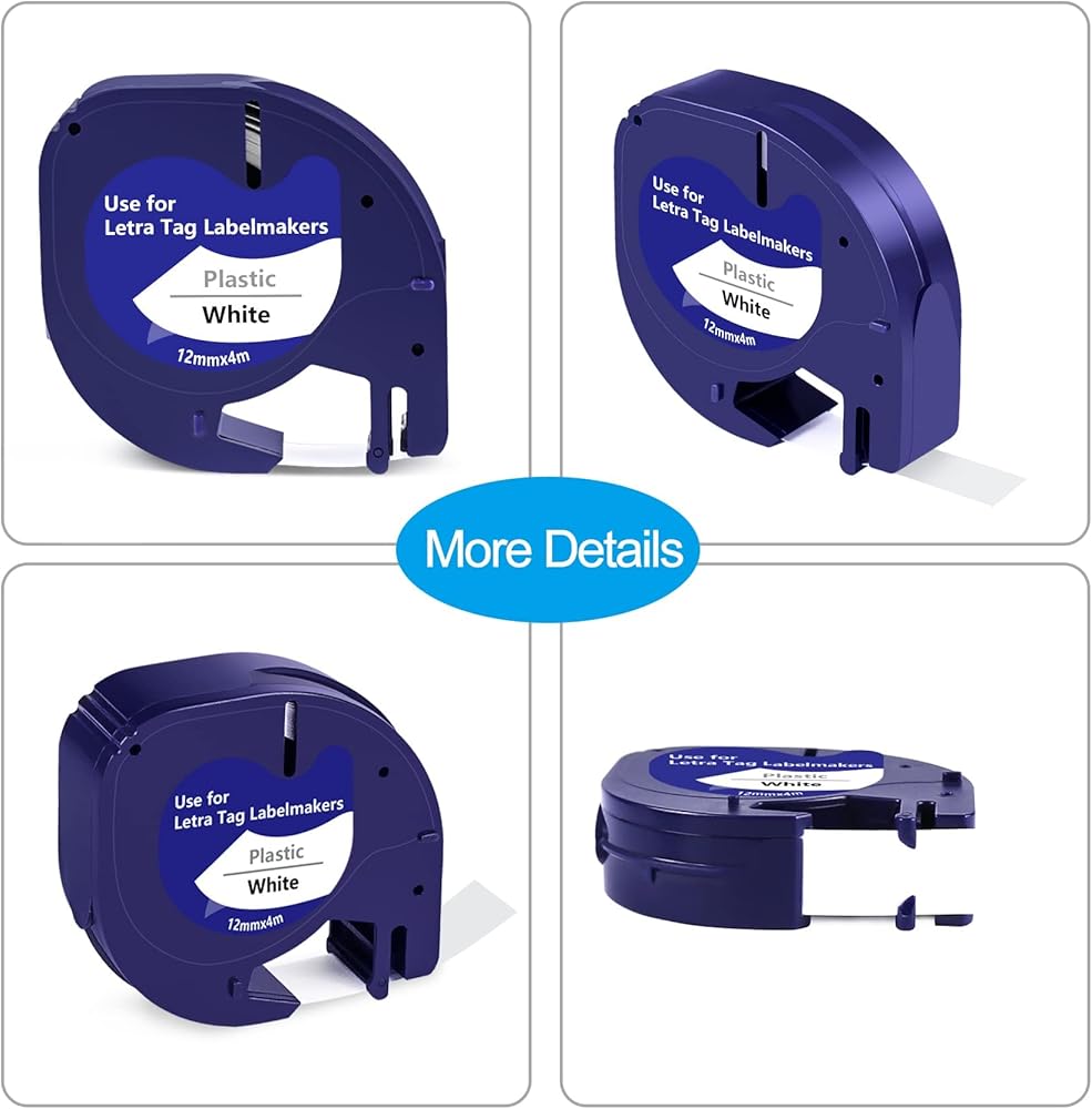 Letra Tag White Plastic 91331 Replacement for Dymo Letratag Refills 1/2 x 13 12mm x 4m Black on White for DYMO LetraTag 200B 100H 100T Plus QX50 Label Makers, 5 Packs