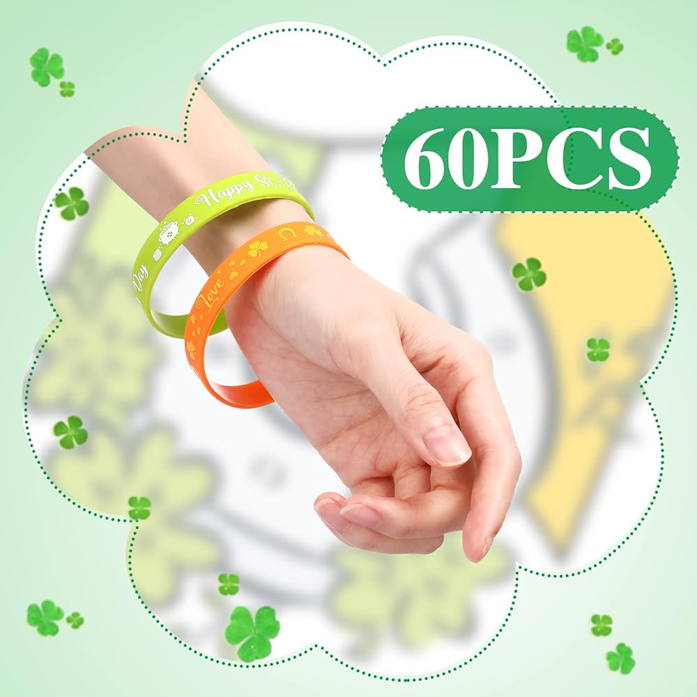 Threan St. Patrick's Day Silicone Wristbands Bracelets 10 Styles Green Shamrock Bracelets St Patricks Day Kids Party Favors for Holiday Supplies Accessories Gifts Decorations (60 Pieces)