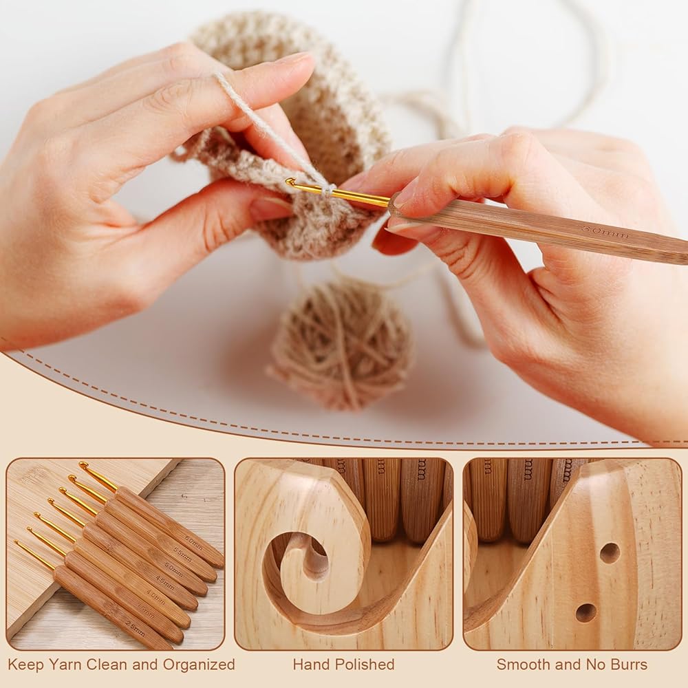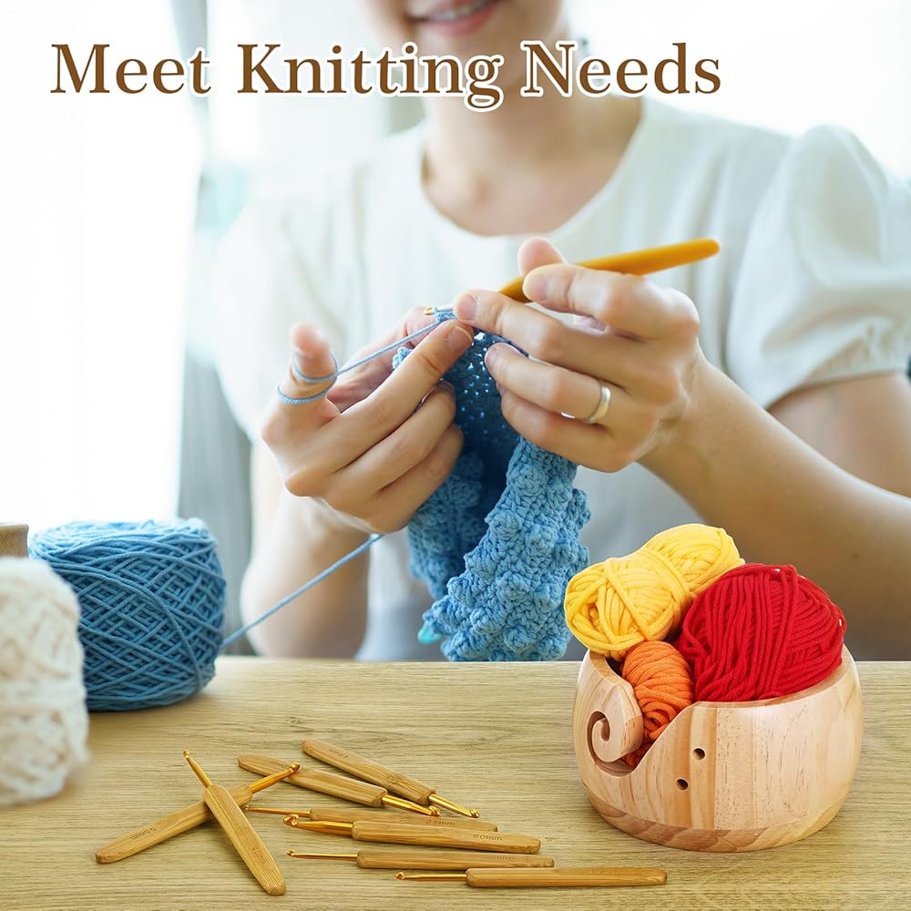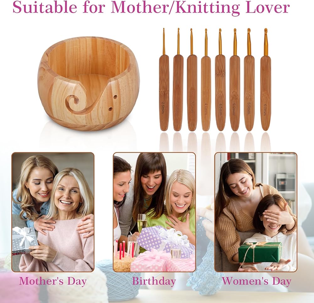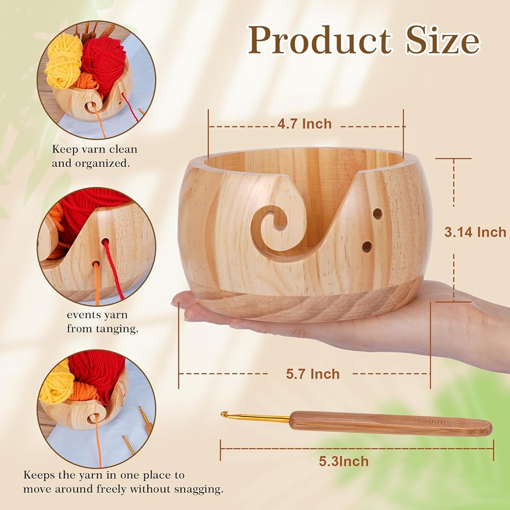 Wooden Yarn Bowl with 8Pcs Metal Crochet Hooks, Knitting Yarn Bowl with Holes Storage Handmade to Prevent Slipping, Perfect Yarn Holder Bowl for Crocheting and Knitting Mother's Day Gift 5" x 3"