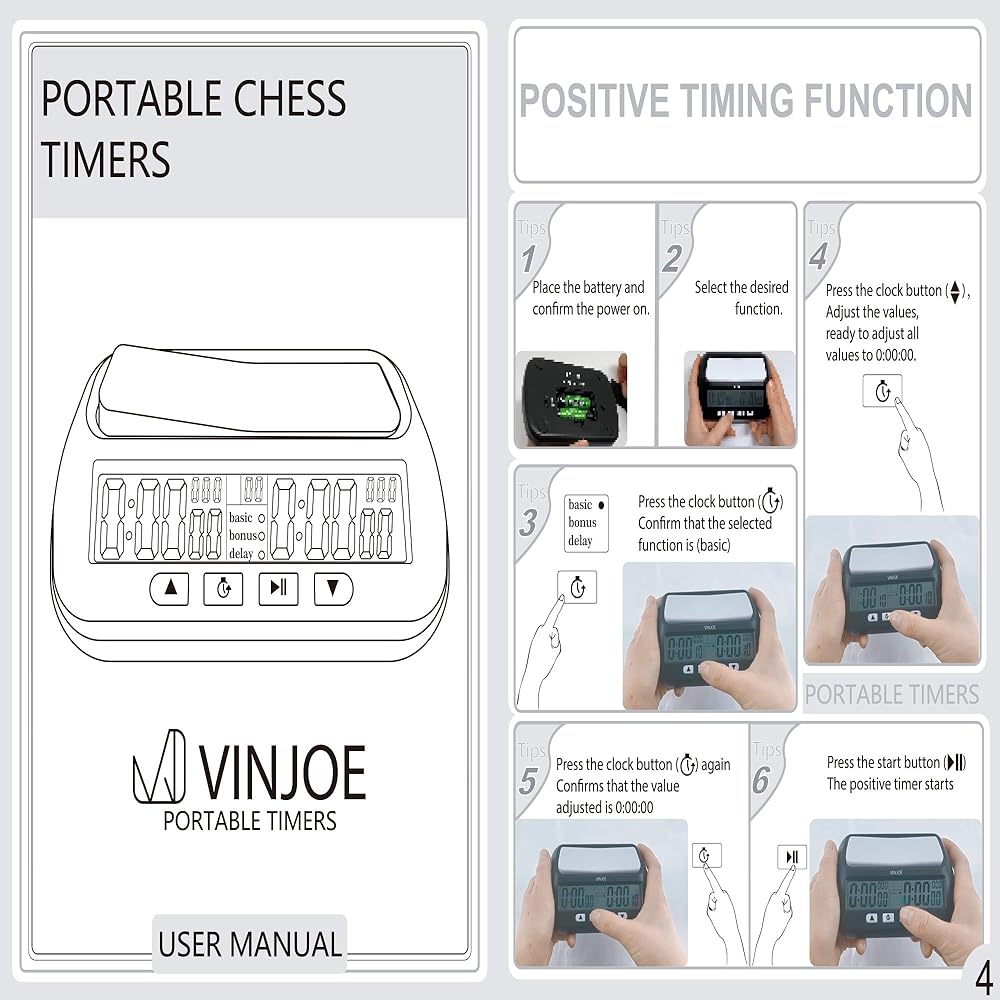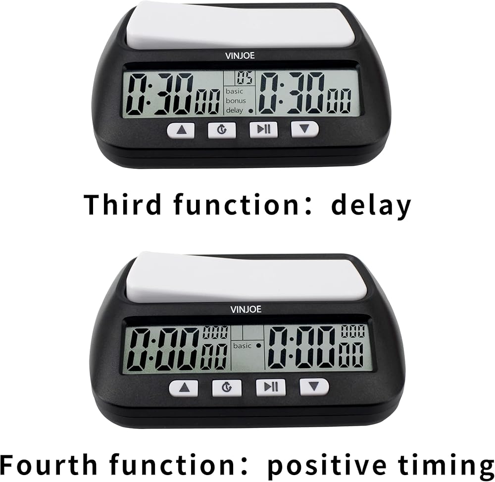 • ♟️【Four functions】♟️ VINJOE digital chess clock has four functions, Basic, Bonus, Delay and Positive Time Features. This portable chess clock can meet the timing functions required for most two-player board games, and four different timing functions add a lot of fun to the game. There is also a most special function, that is, you can return to the initial setting timing rules with one key, avoiding the trouble of restarting or pressing it several times