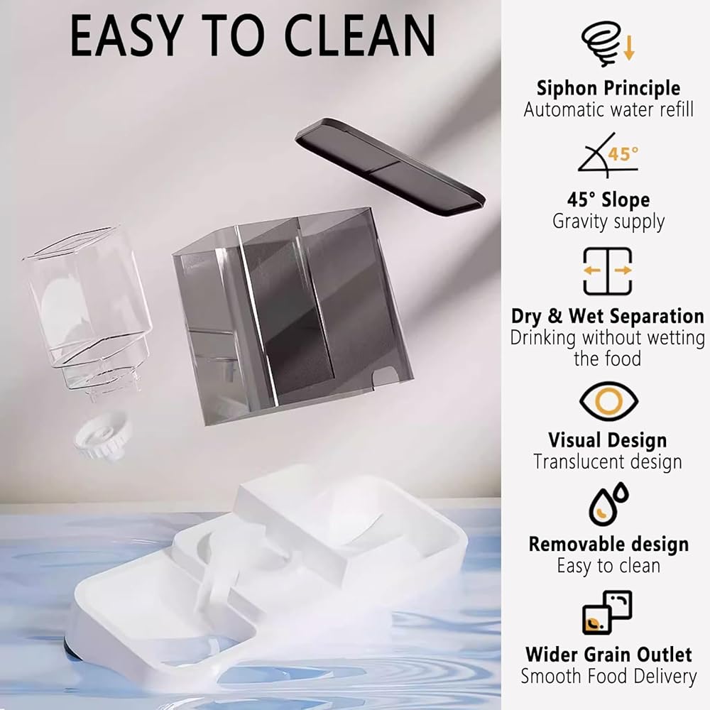 [Easy to Clean] The cat feeder and water dispenser are easy to maintain, with detachable parts for easy cleaning. We recommend cleaning them once a week. Friendly reminder: Do not clean with hot water, as it may cause deformation!