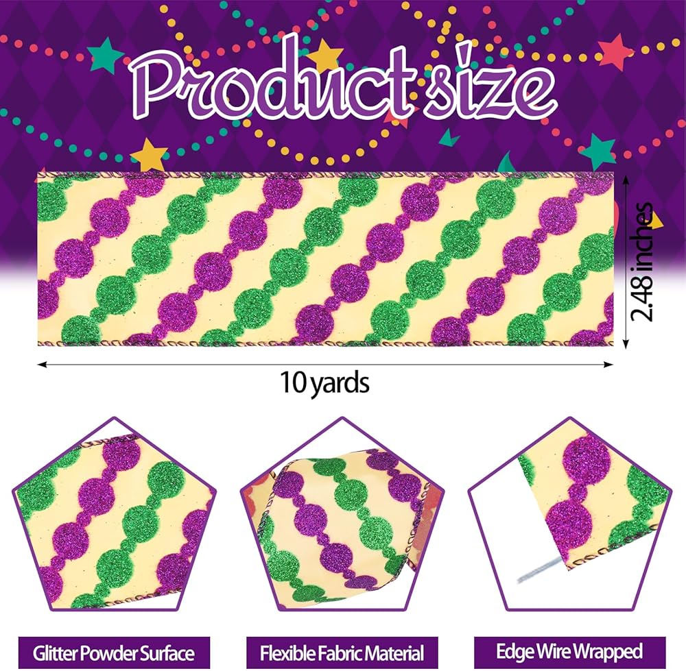 🎆 1 Roll Mardi Gras Fabric Ribbons, Lundi Gras Glitter Powder Decor Ribbons, Fat Tuesday Burlap Linen Edge Wired Ribbons for Mardi Gras Decoration New Orleans Parade Party Favor Gift Wrapping Home Party Crafts Decoration Supplies, 2.5 Inch x 10 Yards x 1 Roll 🎆