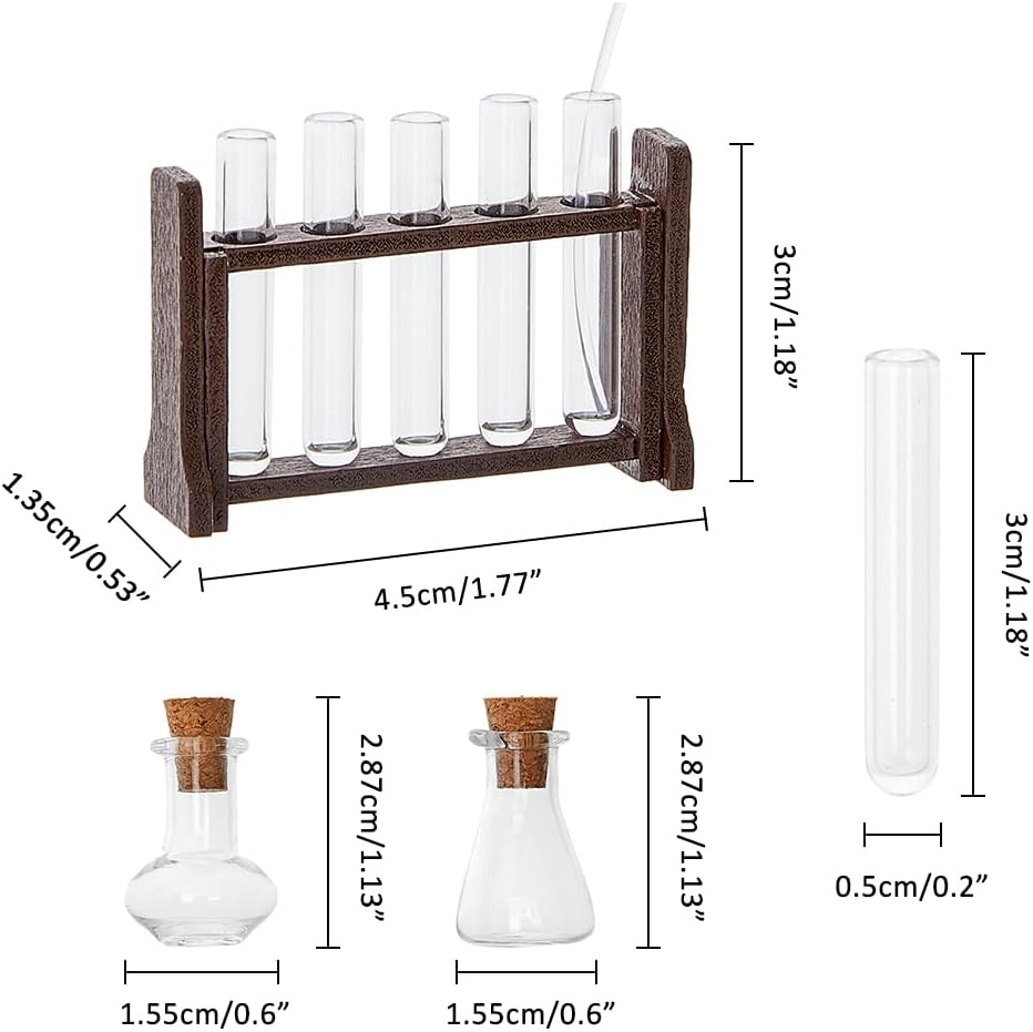 Size: You will receive 5 mini test tubes, 1 wooden stand, 2 glass bottles and 1 small hose. The test tubes measure 30x5mm with 3mm holes, the stand measures 30x45x13.5mm with 3mm and 5mm holes, and the glass bottles measure 15.5x28.7mm with 6.2mm holes.
